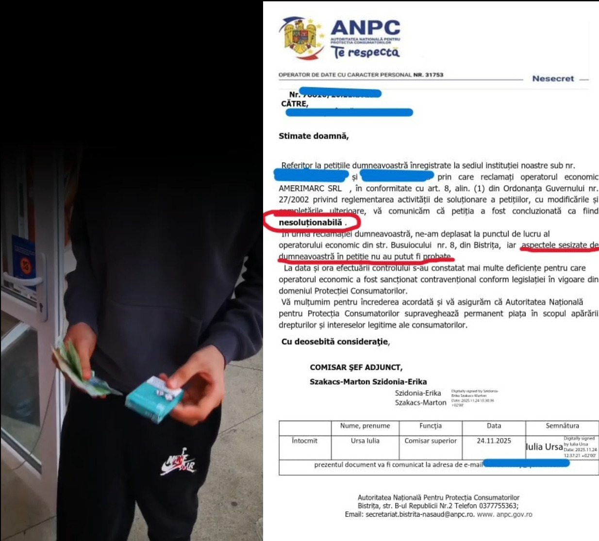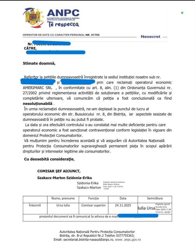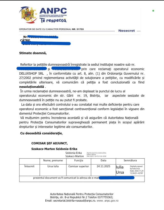 ”O săptămână mi-a luat până am reușit să fac sesizarea. Încercati să faceți o reclamație, să vedeți câte vă cer în reclamația aia: CUI-ul firmei, de exemplu, care la magazinul de la gară nici nu era afisat. Ba te pune și să îți faci cont pe RoelD. Am așteptat patru zile să-mi aprobe cererea de înscriere. Într-un final, sesizările mi-au fost aprobate și mi-au răspuns că ar fi fost în control dar nu se confirmă cele sesizate de mine!” a povestit bistrițeanca.