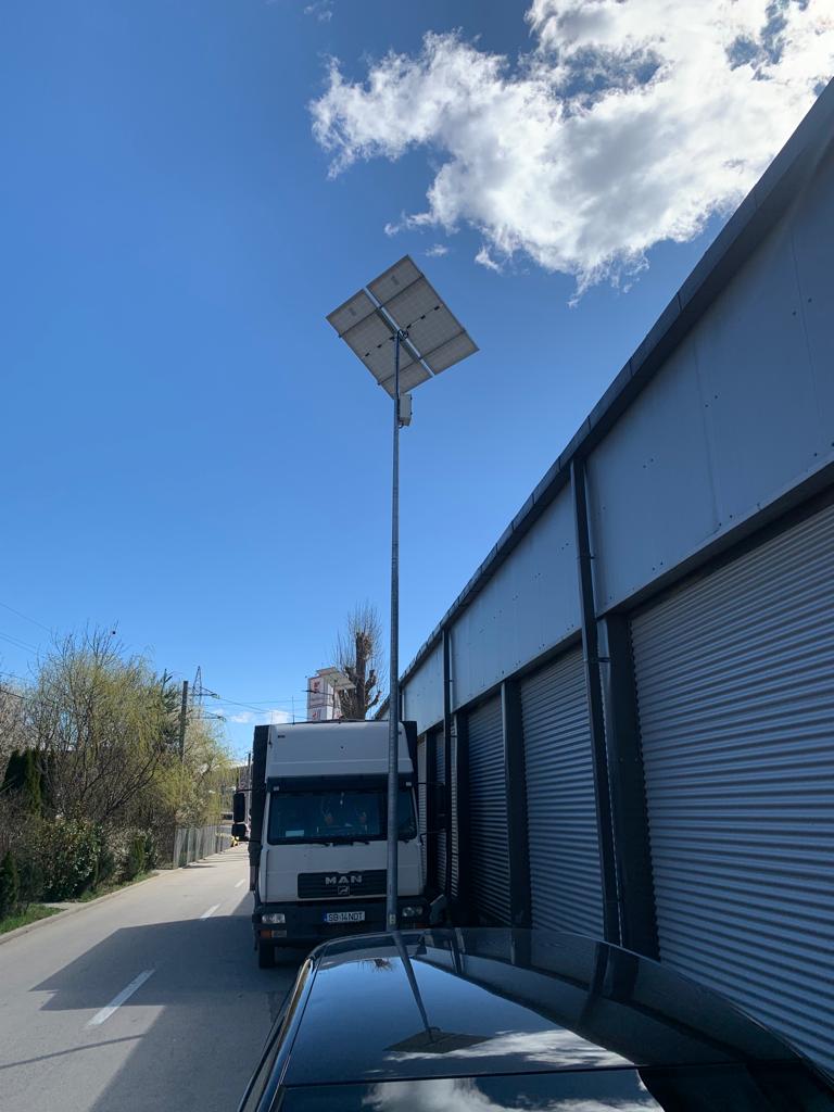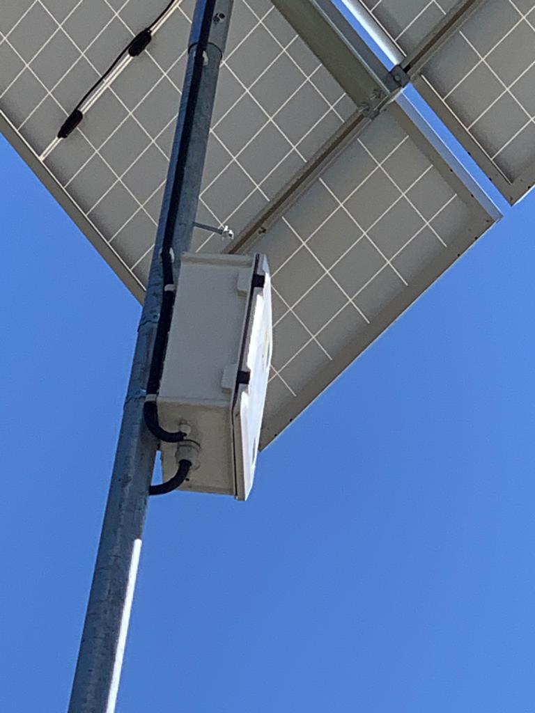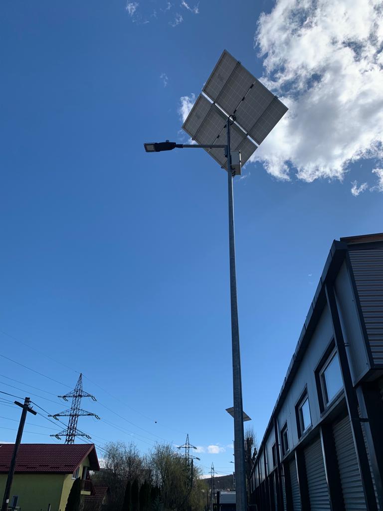 Stâlpul care folosește energie verde s-a rupt din vârf, în zona LED-ului de iluminat. A mai rămas doar stâlpul și panourile solare montate deasupra sa.