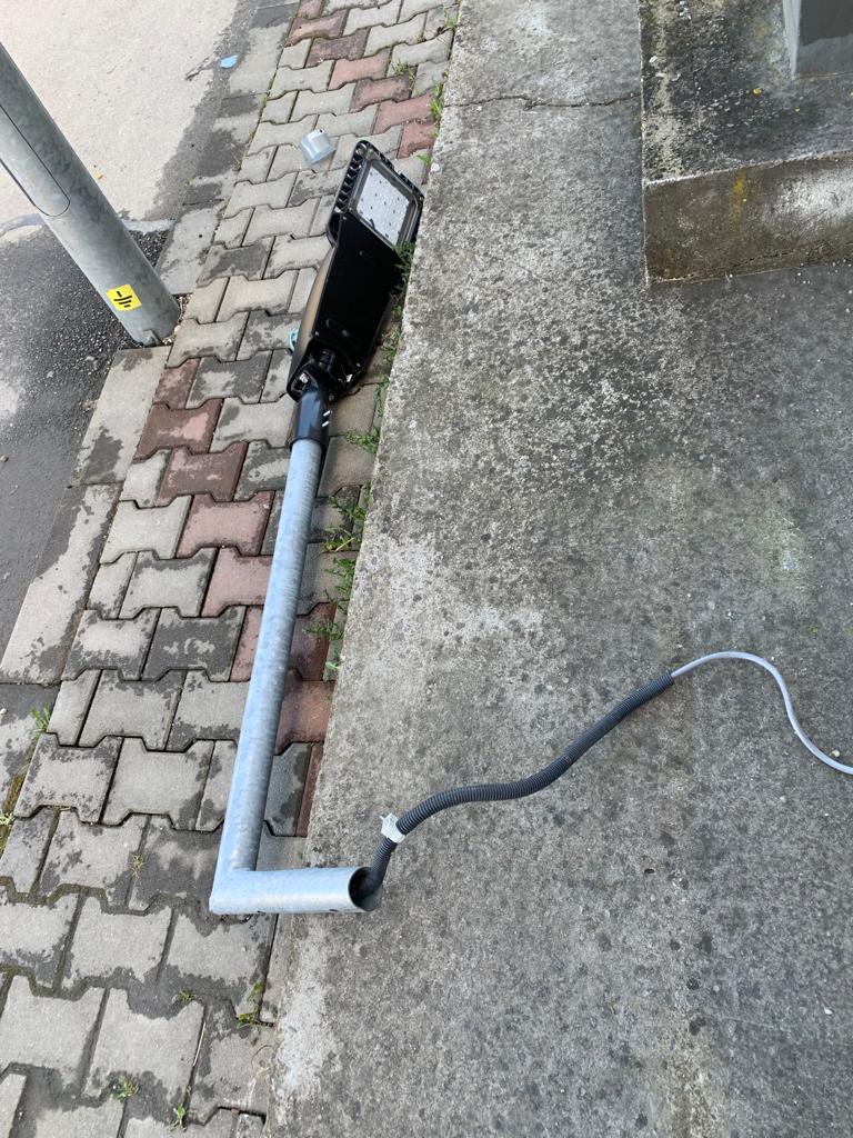 FOTO FII REPORTER: Stâlp de iluminat „proaspăt” montat, căzut în stradă