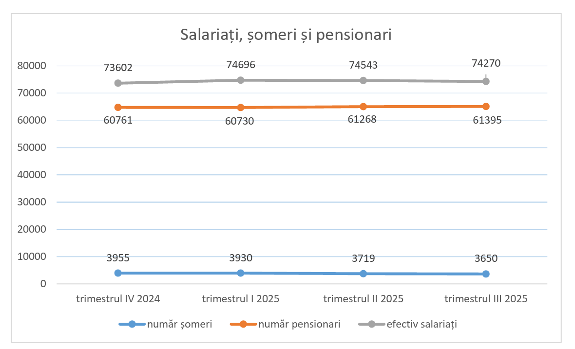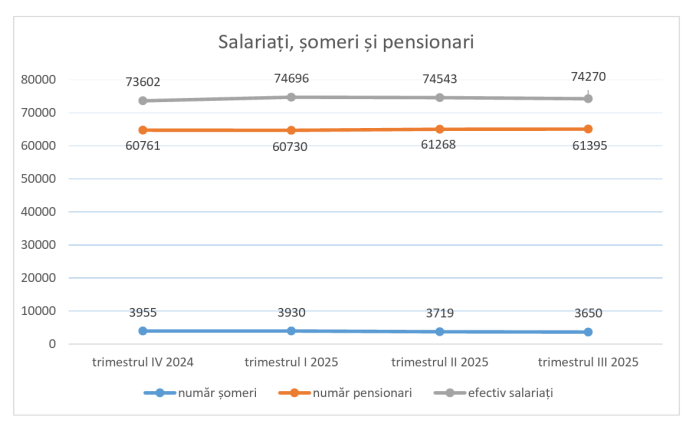 În trimestrul al treilea al anului 2025 numărul mediu al pensionarilor de asigurări sociale de stat din judeţ a fost de 61395 persoane, în creștere cu 327 persoane comparativ cu trimestrul corespunzător al anului 2024.