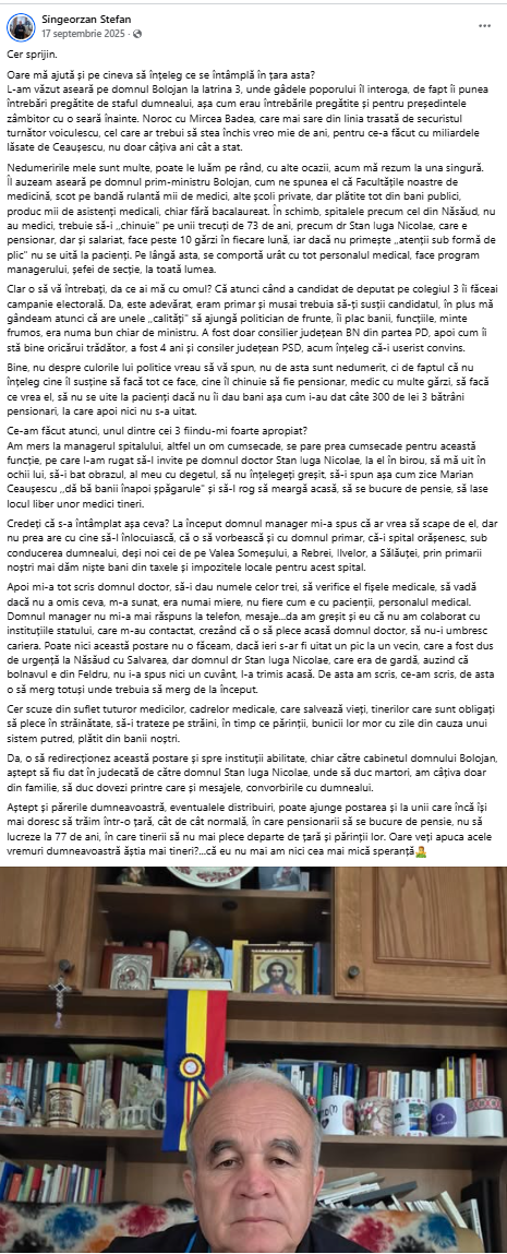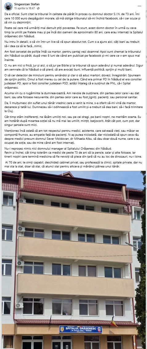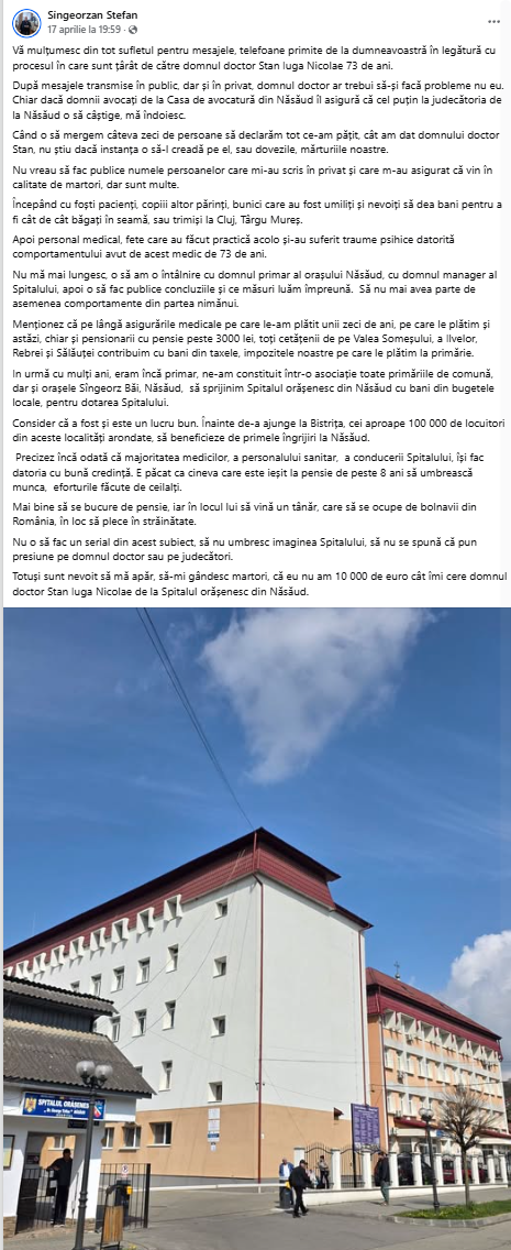 În toamna anului trecut, fostul primar al comunei Feldru, Ștefan Sîngeorzan, a postat un mesaj pe Facebook prin care îl acuza pe medicul Stan – Iuga de șpagă.