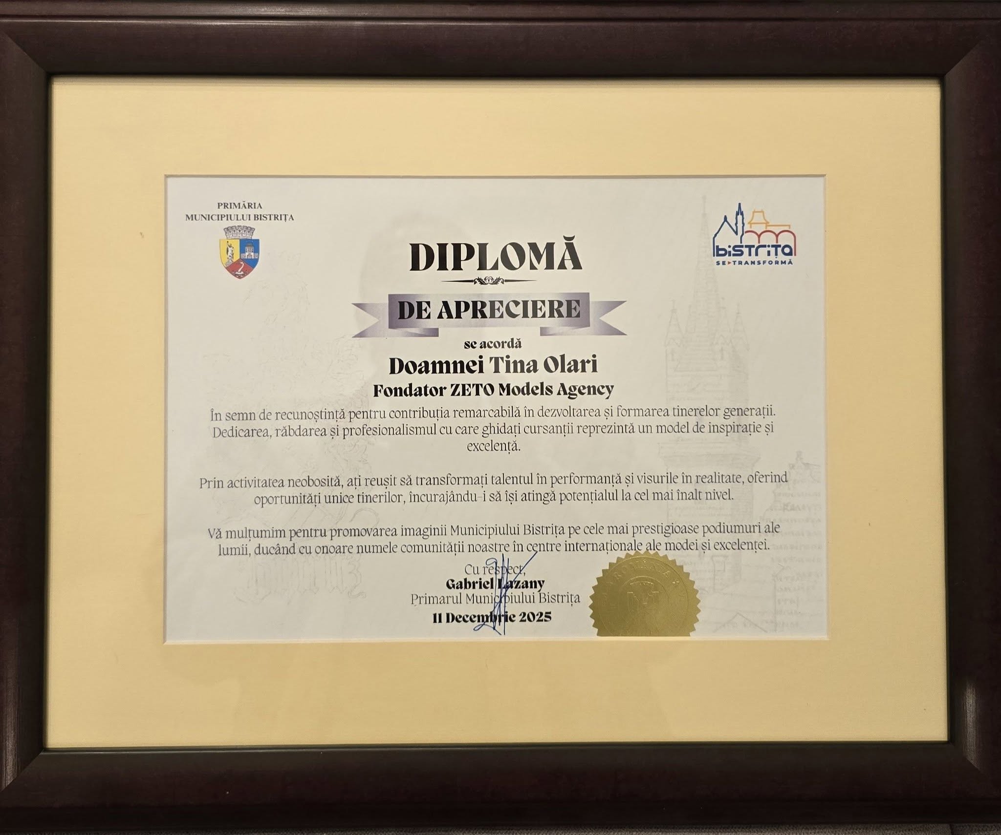 Cea de-a treia ediție a ZETO MODELS FASHION SHOW, eveniment ce a avut loc joi, la Domeniul Transilvania, a fost una cu totul specială, plină de eleganță, frumusețe și emoții. 100 de modele au defilat, cu atitudine, dezinvoltură și încredere de sine în fața celor 600 de persoane prezente în sală. Designerul Tina Olari, cea care se află în spatele ZETO Models Agency, a primit Diploma de apreciere și recunoștință pentru aportul pe care îl aduce tinerilor și orașului, din partea primarului Gabriel Lazany.