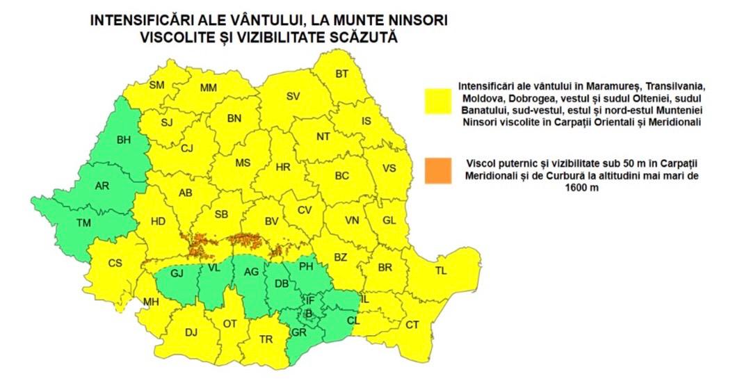 - Fenomene vizate: intensificări ale vântului, ninsori viscolite la munte