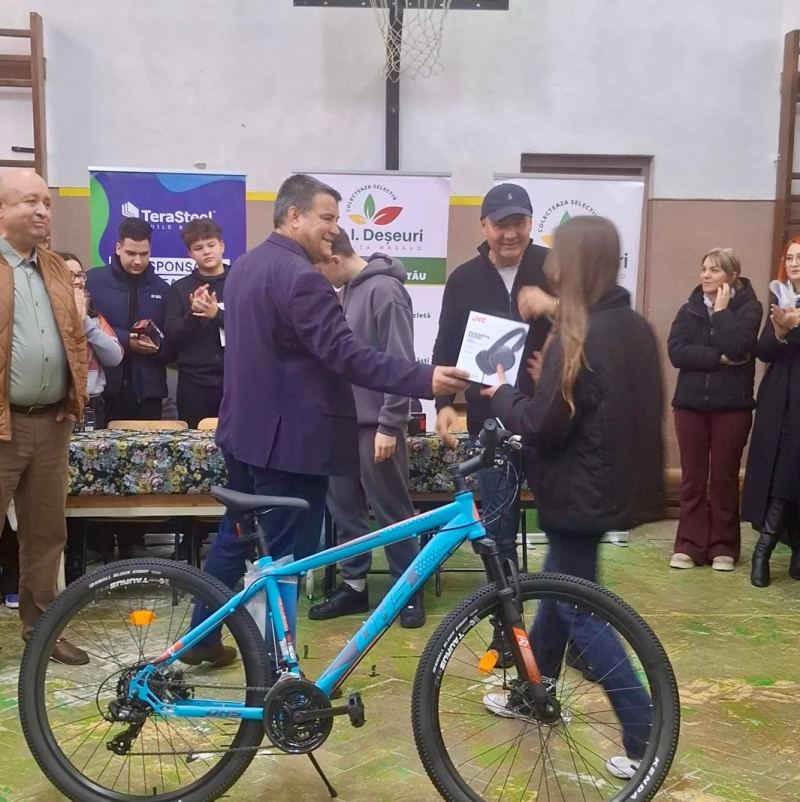 La Liceul Tehnologic Telciu s-au adunat 1,3 tone de deșeuri reciclabile. Câștigătorul bicicletei a fost Daria Cosmuța cu 322 kg.