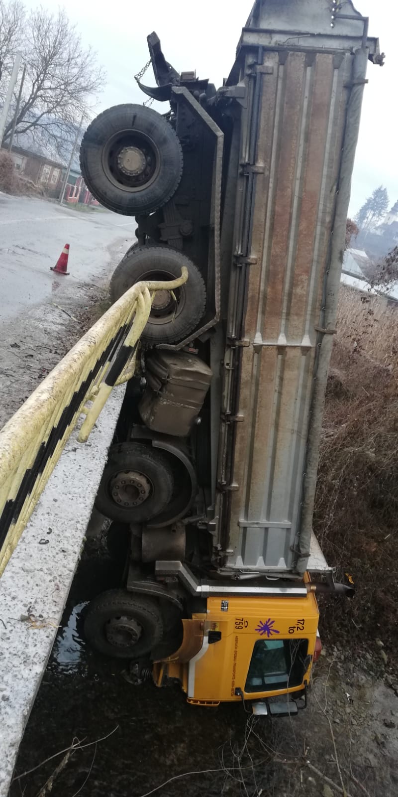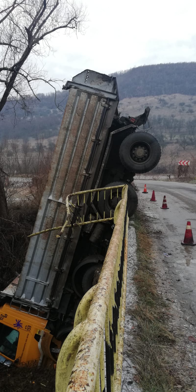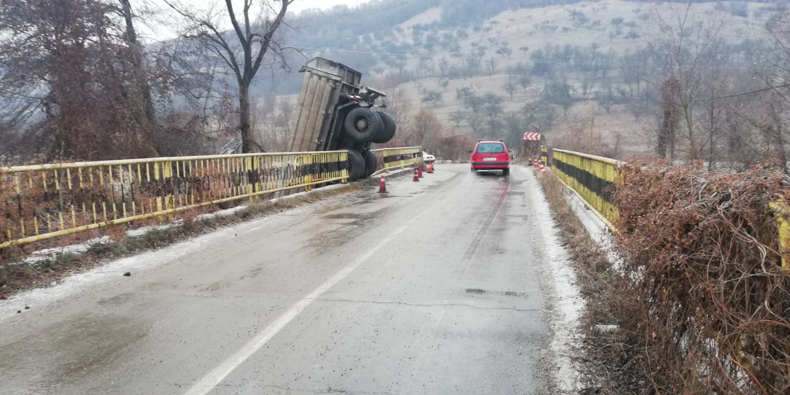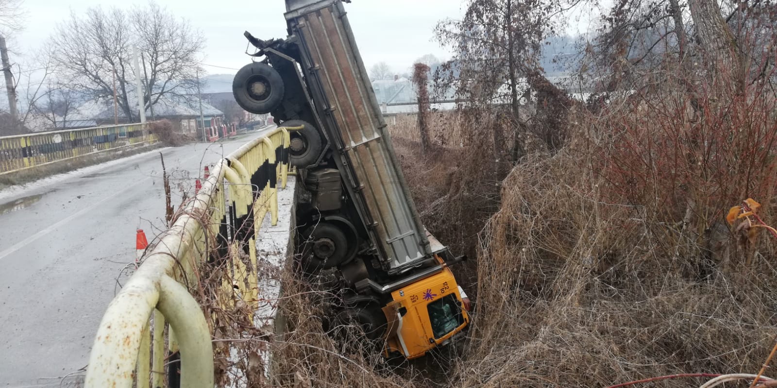 Șoferul unei basculante nu a reușit să redreseze mastodontul, după ce acesta a derapat din cauza poleiului. Astfel, a tot trecut prin barele de la marginea podului și a aterizat în albia râului.