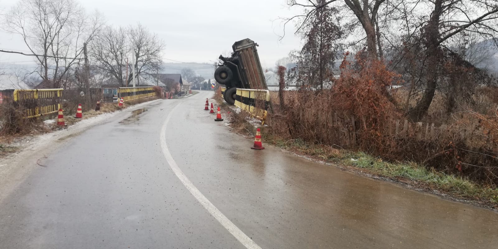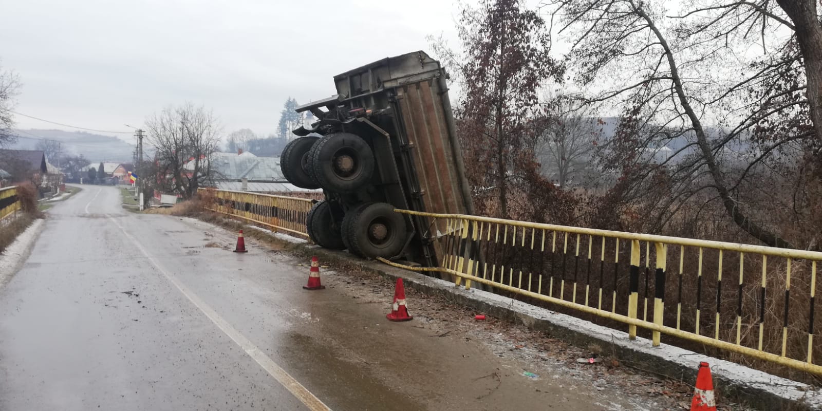 Un accident rutier a avut loc în localitatea Ciceu-Giurgești. Din cauza poleiului, o basculantă a derapat și a sărit de pe pod, aterizând în albia râului.
