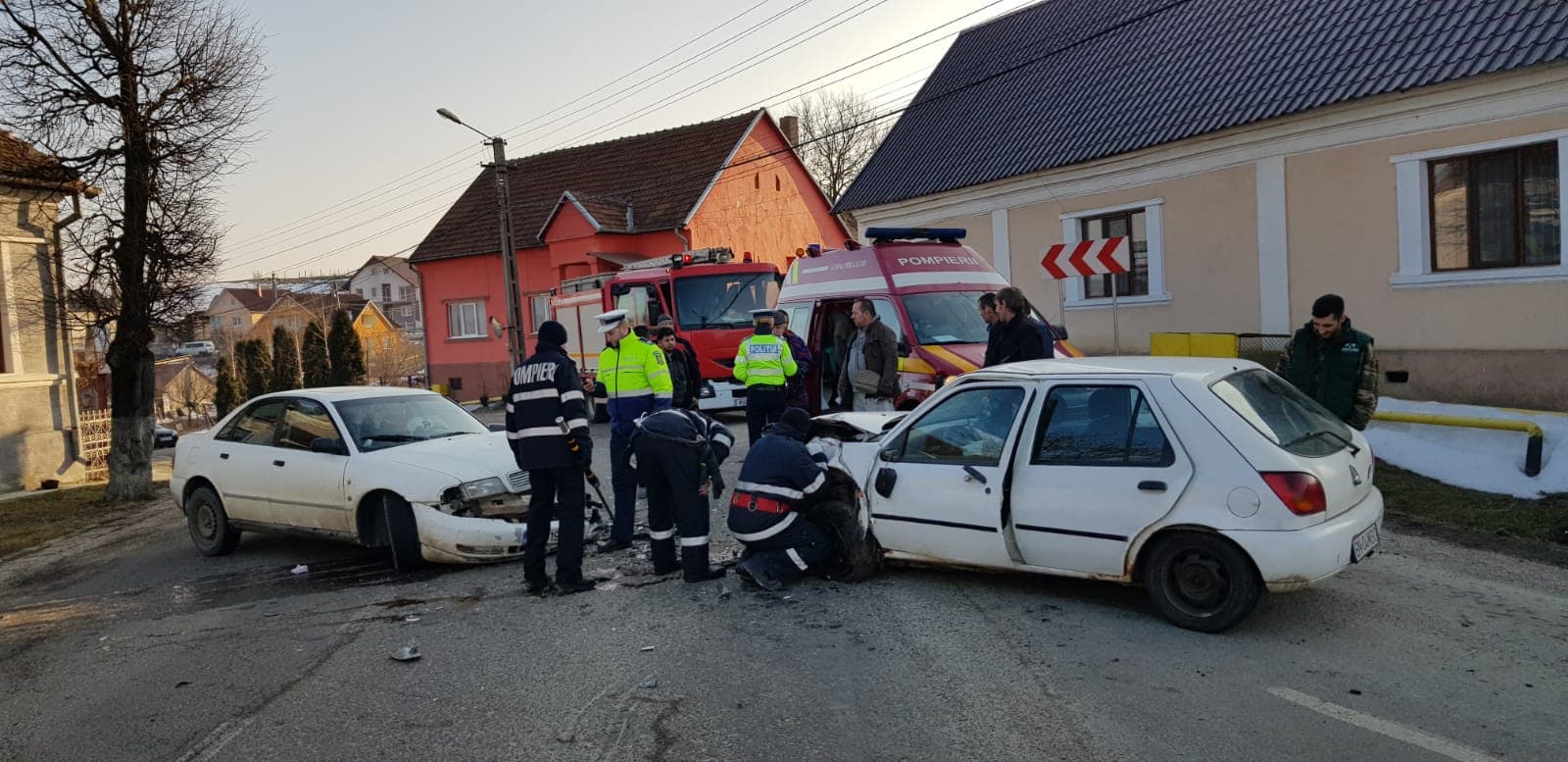 „În cele două autoturisme se aflau 4 persoane, iar una dintre acestea (o femeie de aproximativ 60 de ani) va fi transportată de către un echipaj de prim ajutor SMURD la Unitatea de Primiri Urgențe Bistrița. Victima este conștientă și cooperantă. Pompierii militari lucrează pentru sablarea carosabilului în urma scurgerilor de combustibil”, transmit reprezentanții ISU Bistrița.