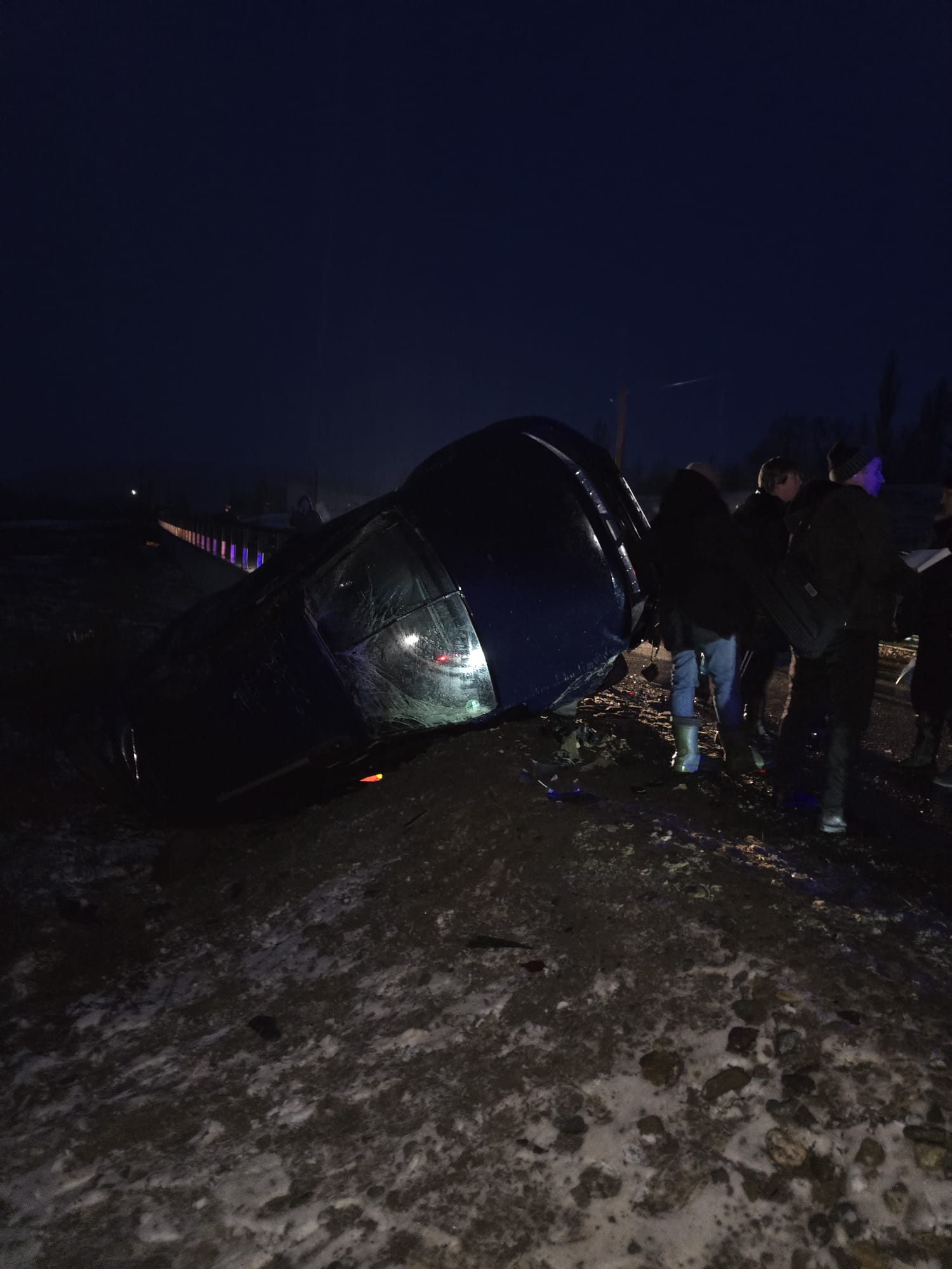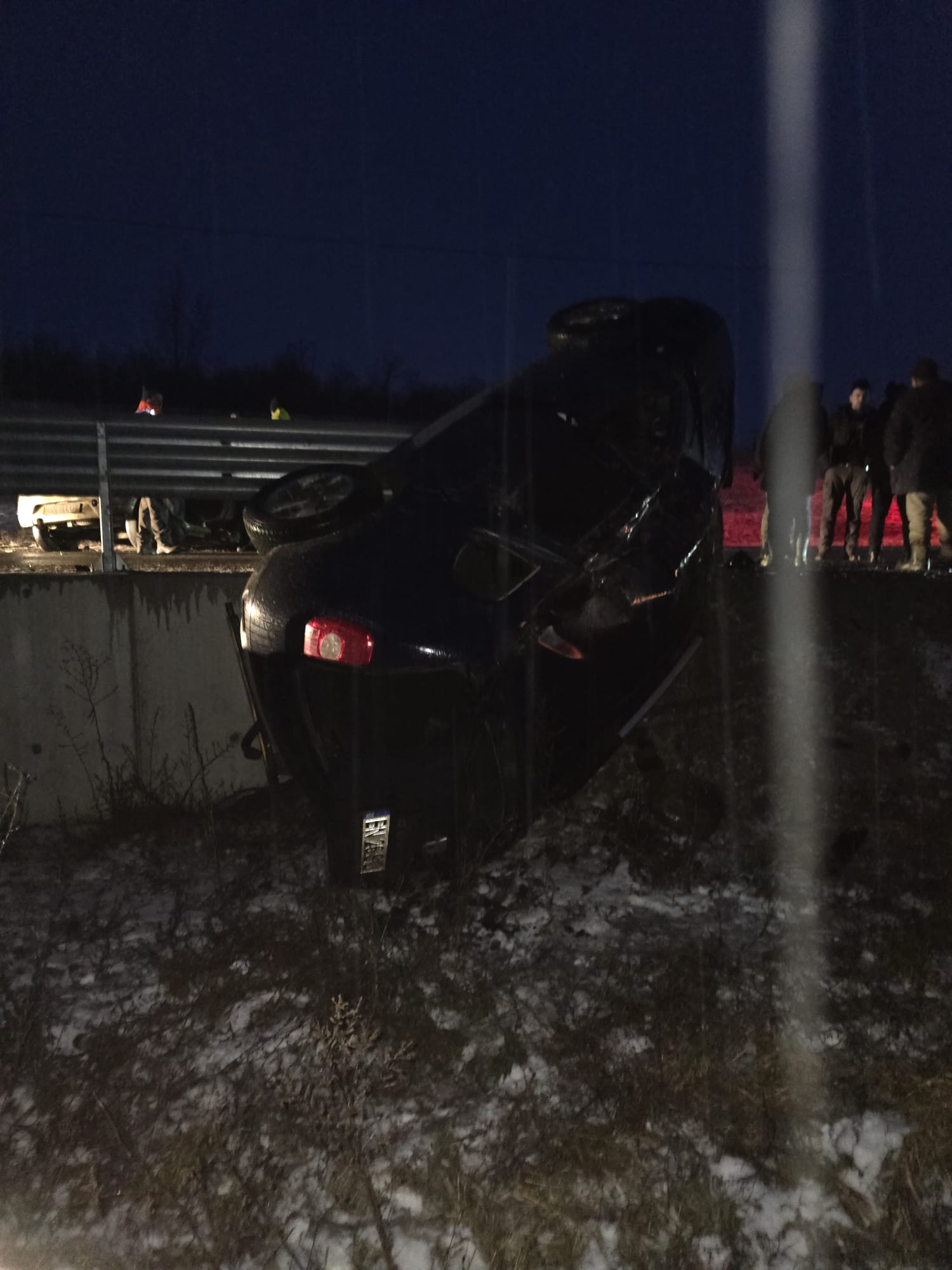 Una dintre mașini a ajuns răsturnată pe lateral, în șanț.