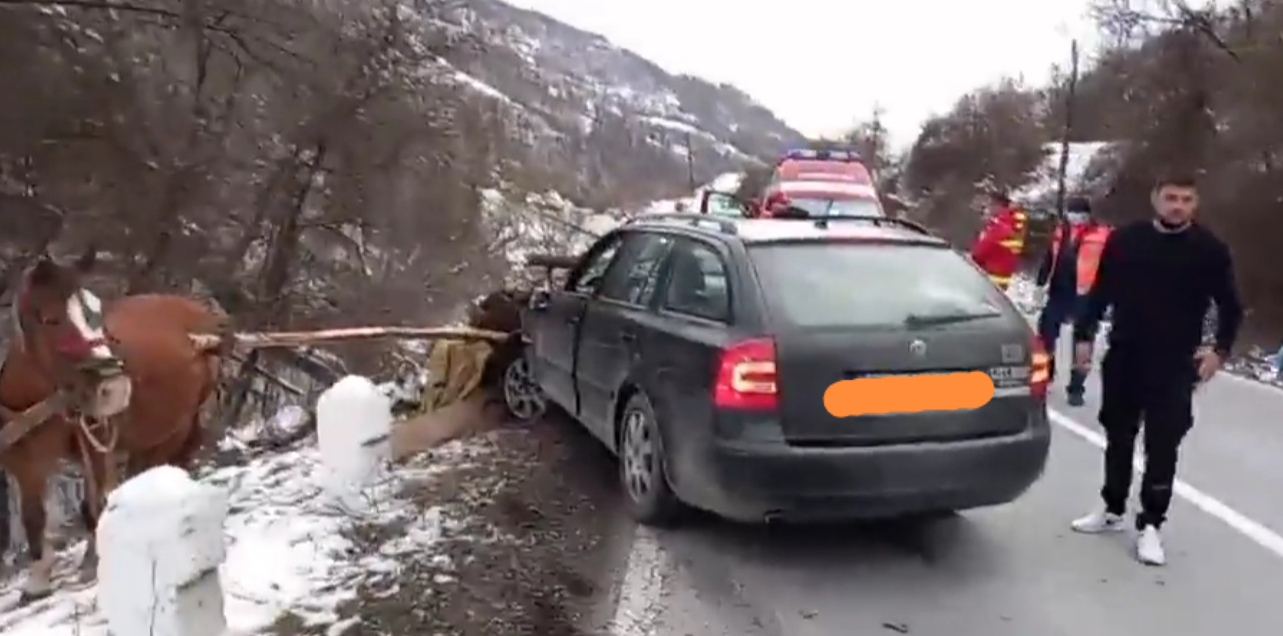 În accident au fost implicate două autoturisme, o camionetă și o mașină, ambele avariate. Mașina, după impact, a acroșat și o căruță trasă de cal.