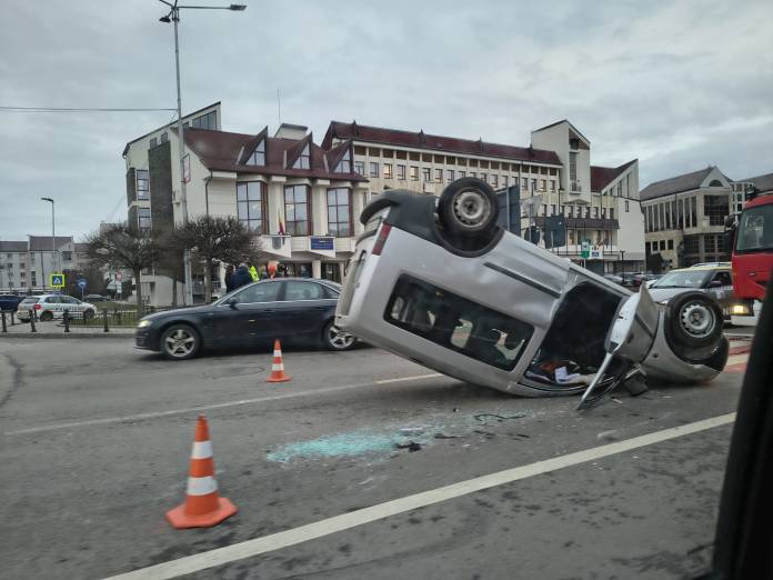 Accident în această dimineață, în Piața Petru Rareș din Bistrița! O mașină a ajuns cu roțile în sus, în zona sensului giratoriu.