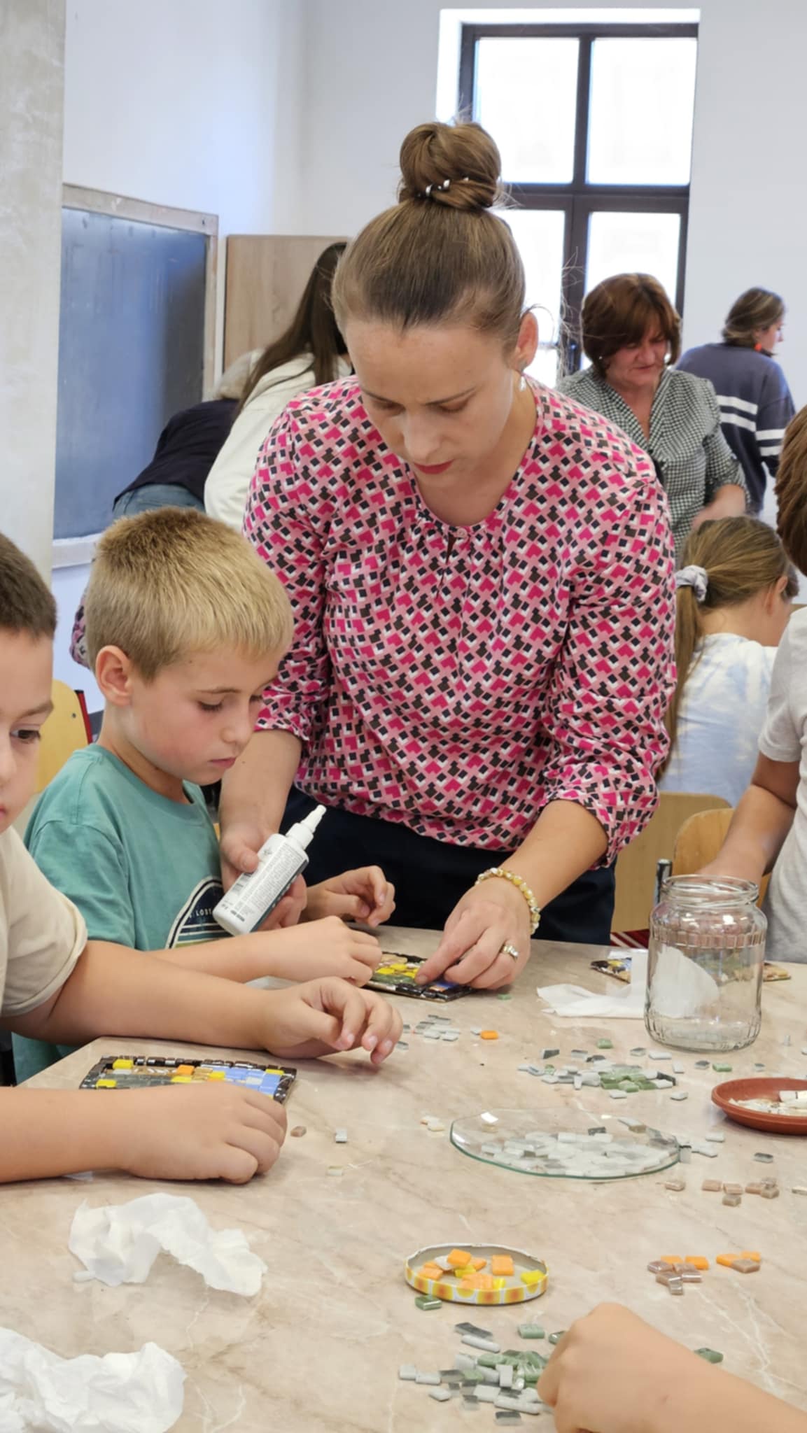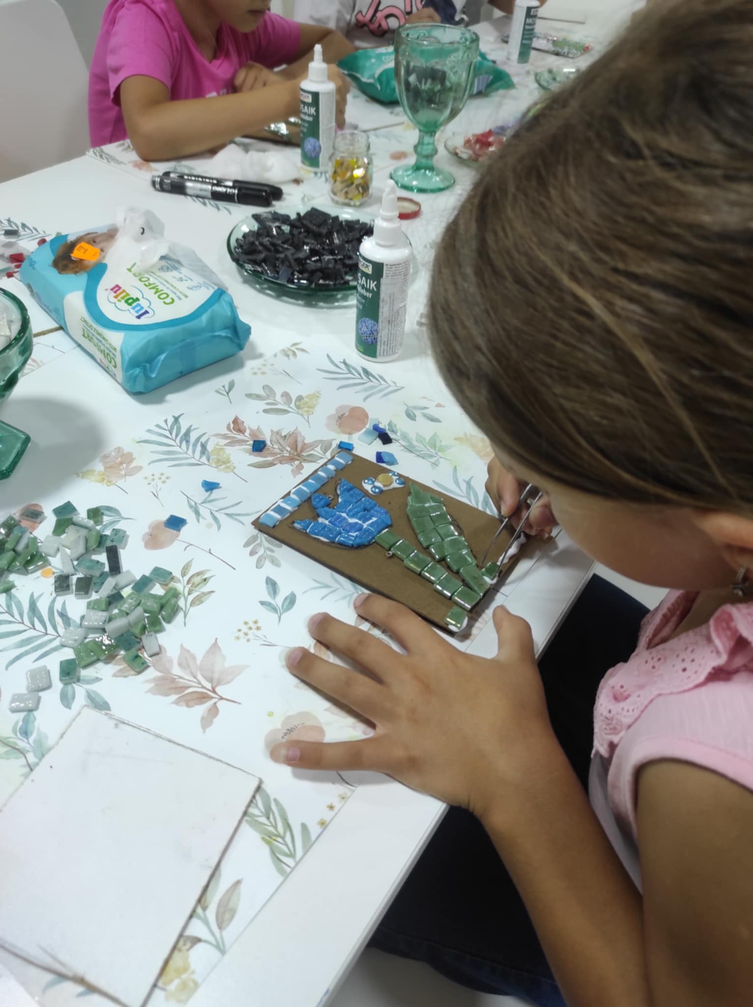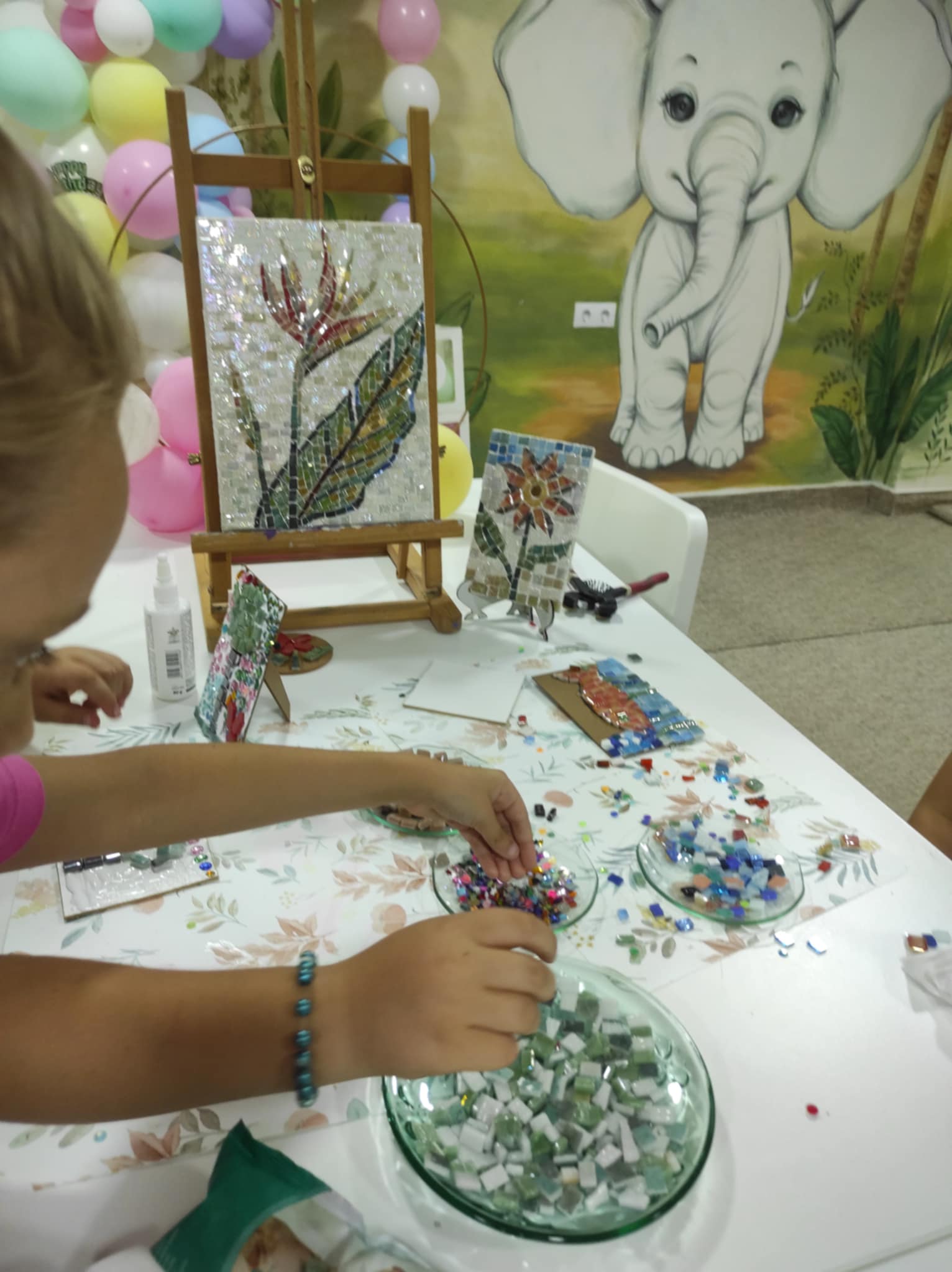 Aici, Alexandra susține și ateliere de pictură, inclusiv pe sticlă, pentru copii, ghidându-i, pas cu pas, să realizeze și lucrări din mozaic.