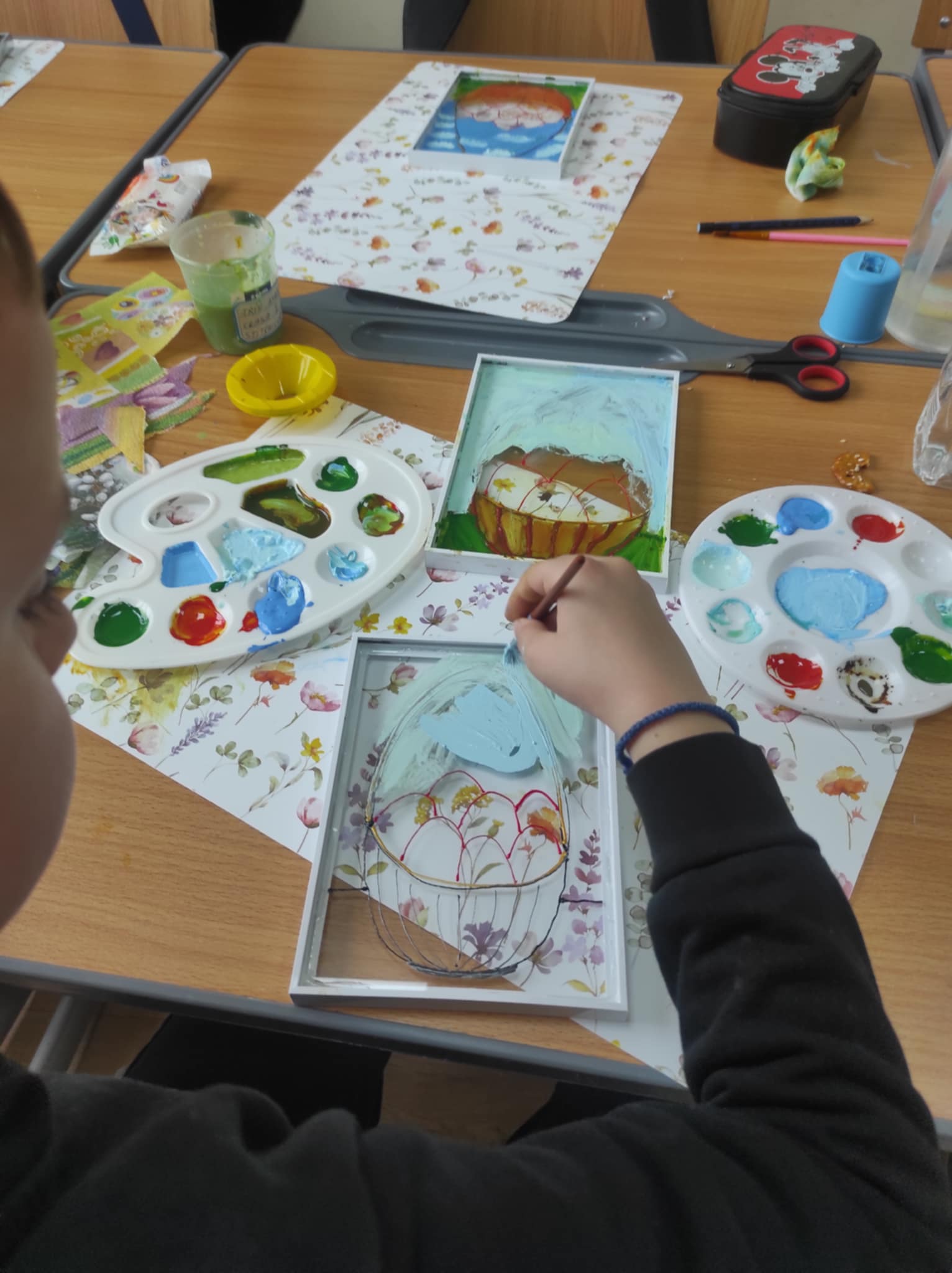 Fiecare în ritmul lui, cu pauze de joacă până se usucă vopseaua, dar fiecare revine la lucrarea lui pentru a o finaliza.