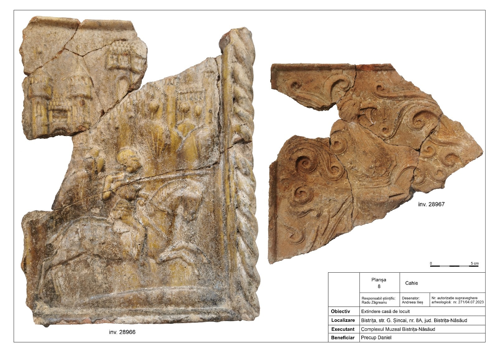 Un alt fragment păstrează partea superioară a stemei orașului medieval Bistrița. Alte cahle sunt ornamentate cu decor floral, unele fiind emailate. Arheologii muzeului au constatat că acestea datează din secolele XVIII-lea și XIX.