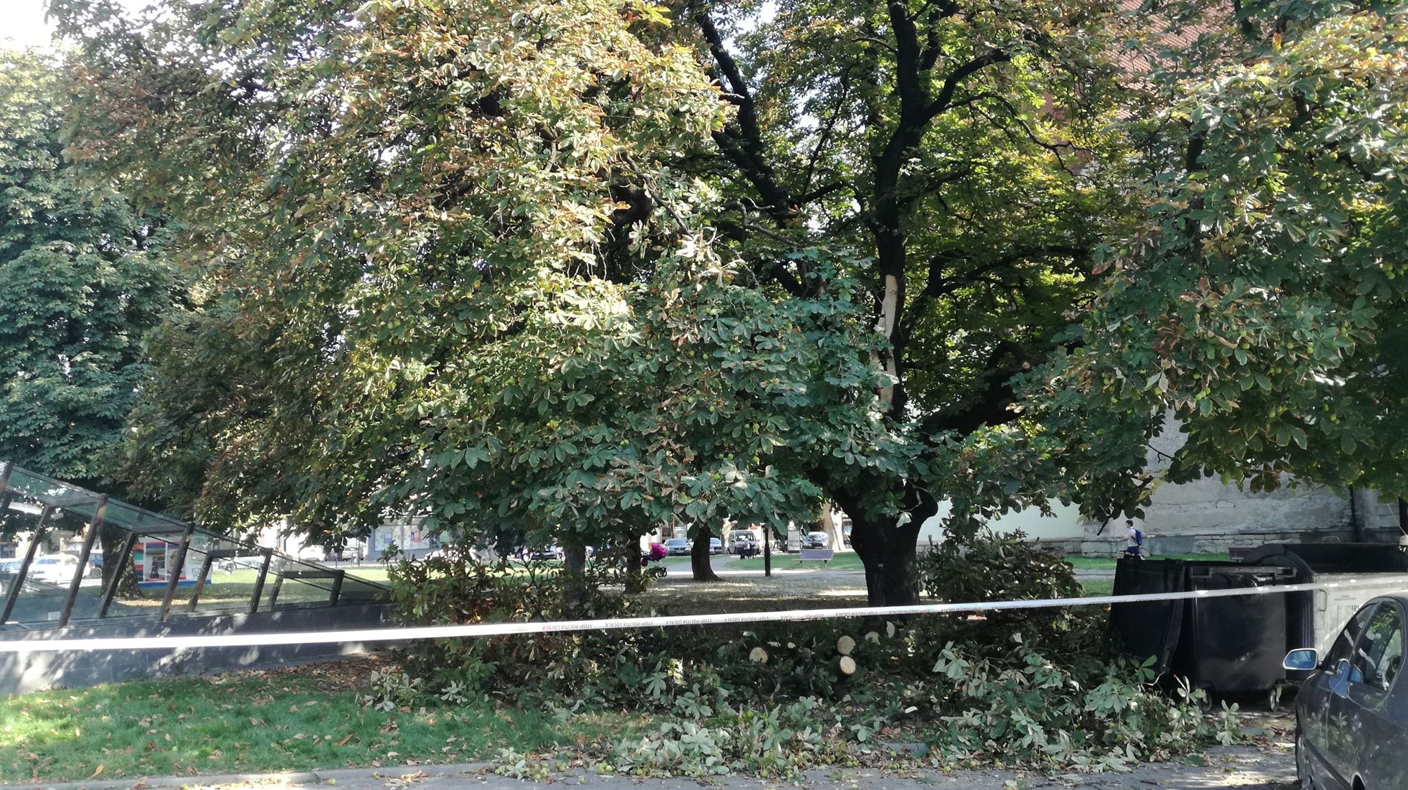 Castanii de lângă Biserica Evanghelică au fost amenințați astăzi cu… drujba. Zona din jurul castanului cu crengi „leșinate” a fost marcată, iar accesul interzis.