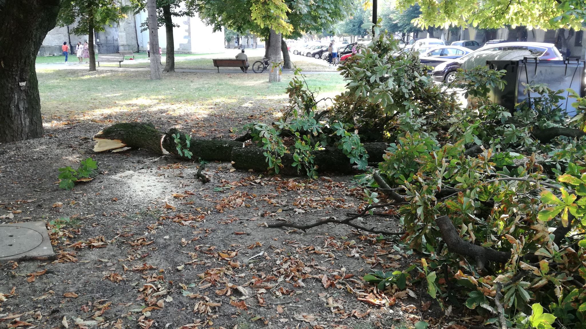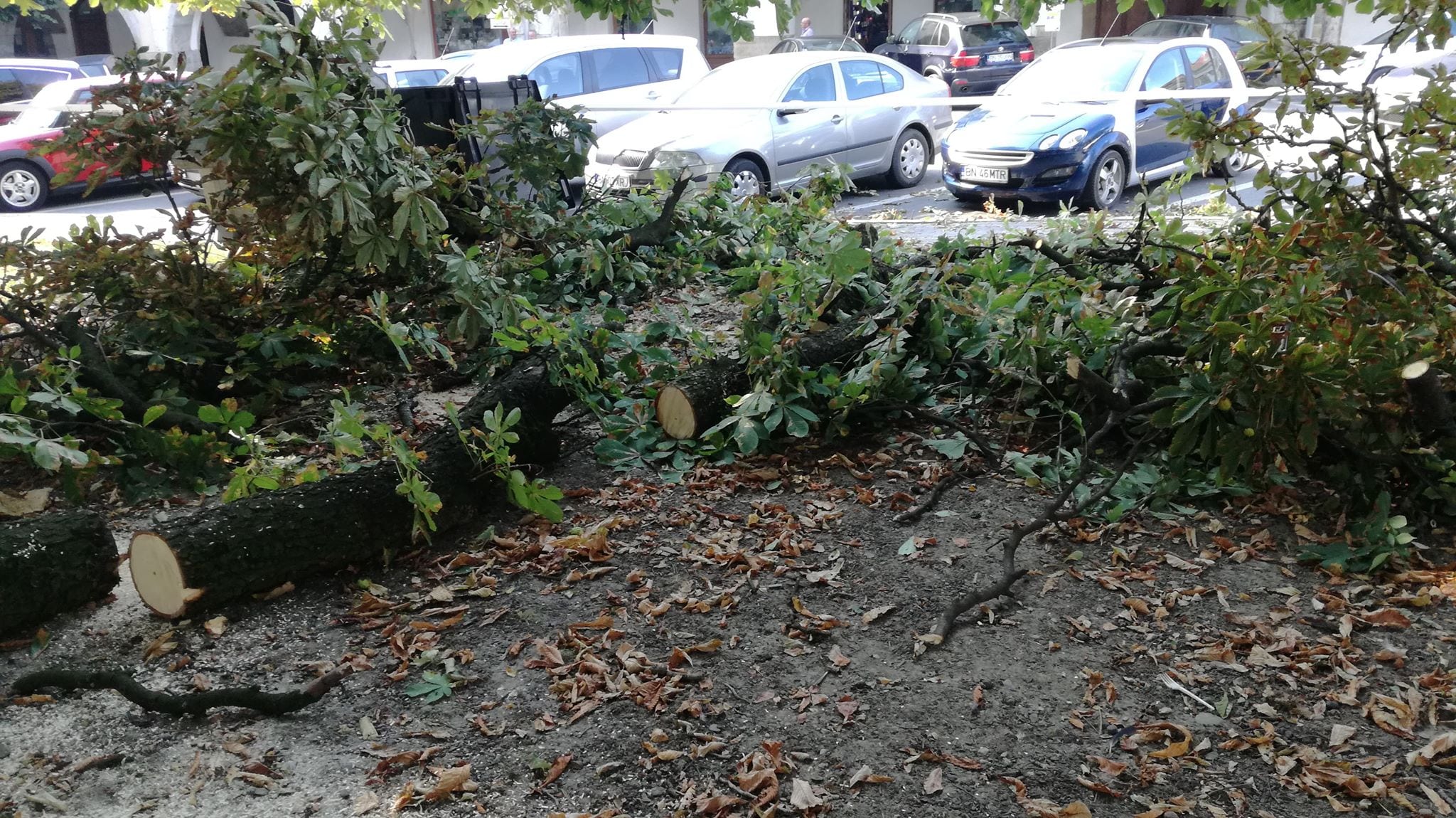 Încă o creangă a căzut pe trotuar. Pompierii voluntari ai SVSU au intervenit și au tăiat și cea de-a doua creangă căzută. Se pare că prima creangă care a căzut în jurul prânzului s-a prăbușit pe două mașini parcare, avariindu-le.