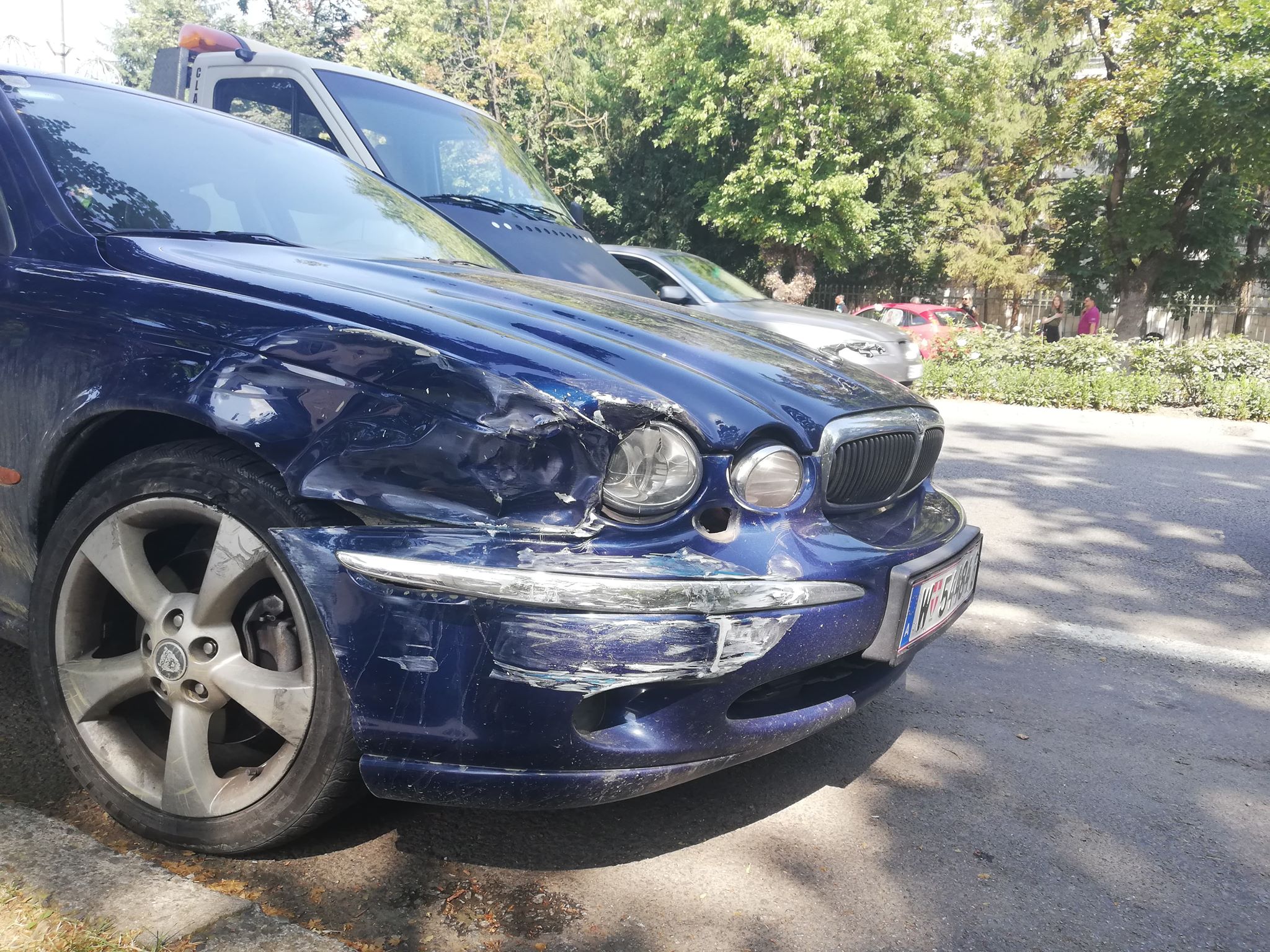 O autoutilitară și un Jaguar veneau dinspre partea de jos a orașului în sus, și au pătruns deodată în sensul giratoriu. La un moment dat, șoferul autoutilitarei a schimbat banda de mers, în sens, acroșând jaguarul. Șoferul autoutilitarei susține că s-ar fi asigurat la schimbarea benzii de mers. Șoferul Jaguarului cu numere de Austria susține că au intrat amândoi în sens și brusc, autoutilitara s-a frecat de mașina lui.