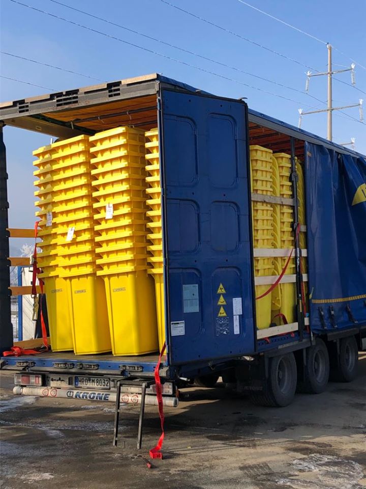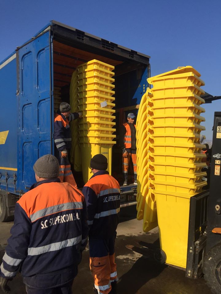 • au început să sosească, din Germania primele loturi de PUBELE GALBENE din cele peste 60.000 de pubele care urmează să fie distribuite în tot județul