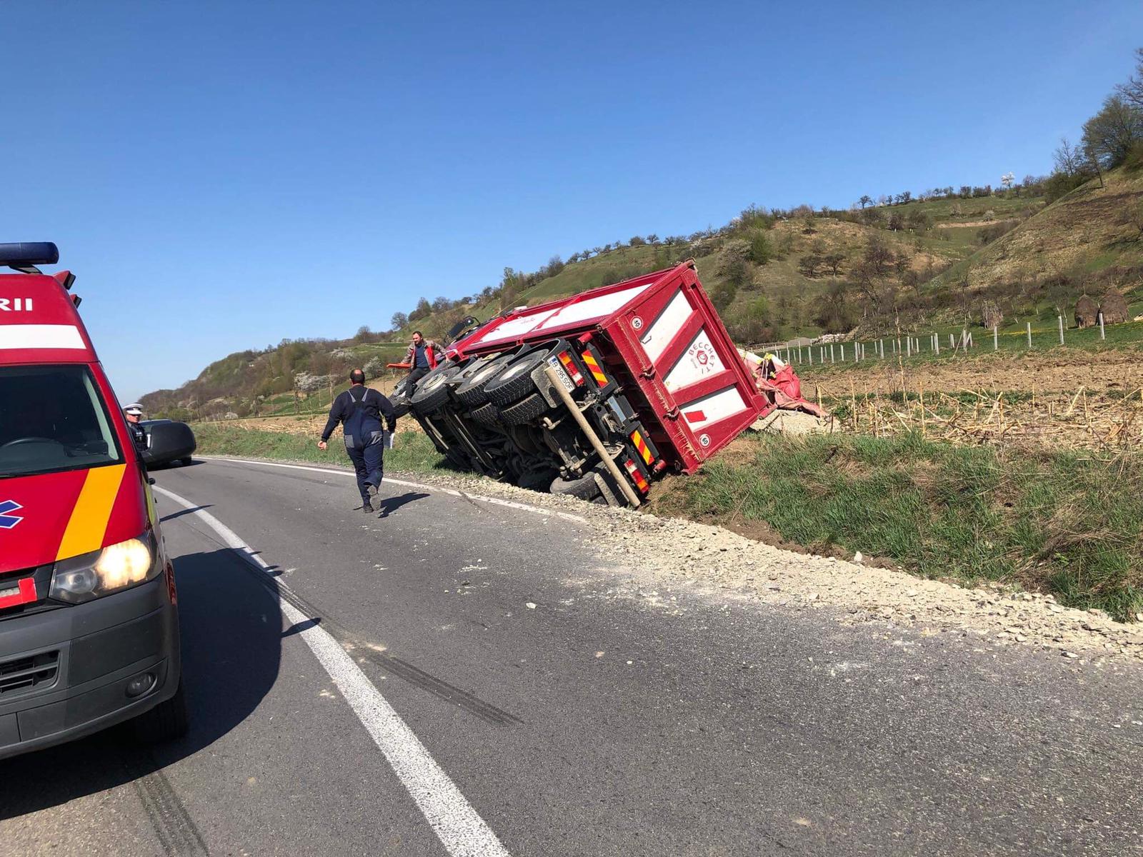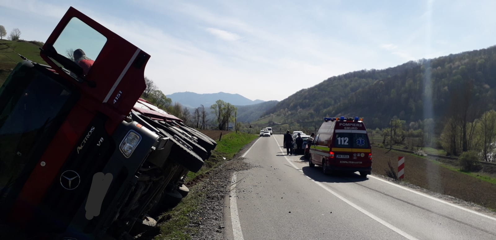 O autoutilitară încărcată cu nisip s-a răsturnat, aproape de intrarea în Feldru, dinspre Năsăud. Aceasta a fost lovită și din față, și din spate, de două autoturisme.