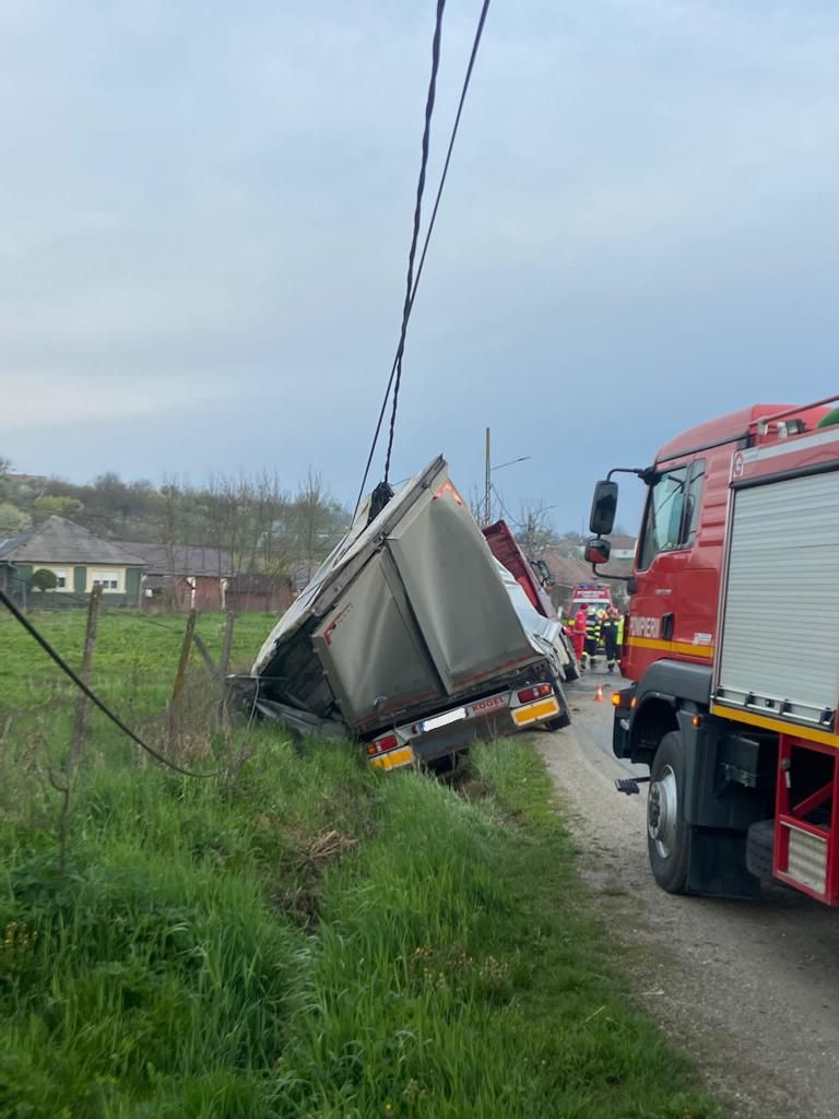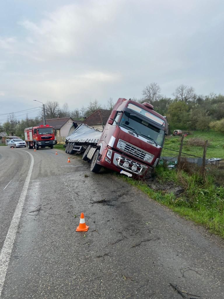 TIR-ul a părăsit drumul într-o curbă și a ajuns în șanțul de pe margine. Șoferul a ieșit singur din cabina autotrenului, iar la sosirea salvatorilor, era conștient și cooperant.