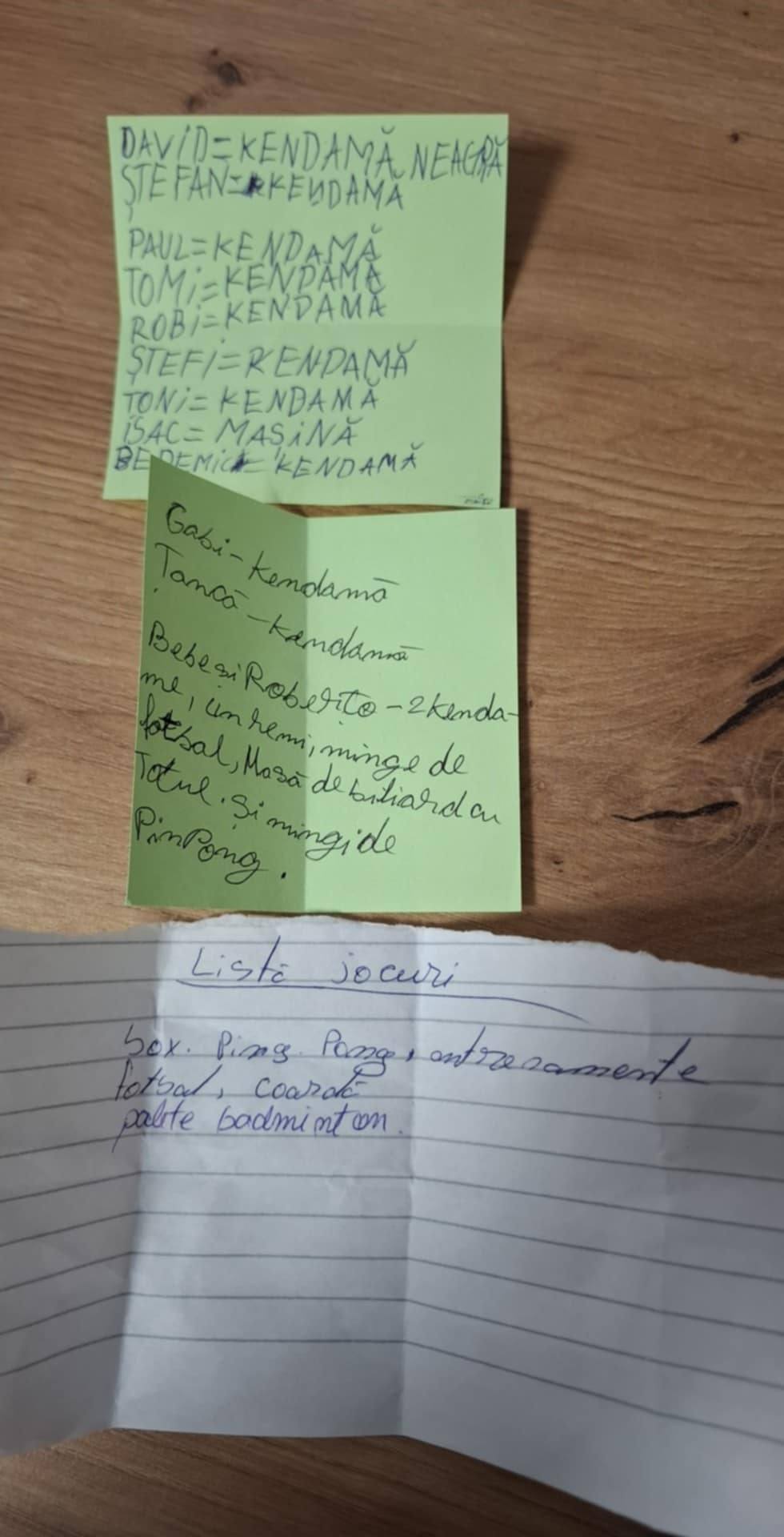 Copilașii au făcut și liste cu lucrurile pe care și le doresc: jocuri de societate (Rummikub, Uno, Activity, Alias, Nu te supăra, frate!), șah, dame, puzzle-uri (pentru diferite vârste), jocuri de logică și cultură generală, seturi creative (pictură, mărgele, lego, origami), set tenis de masă + mingi de ping-pong, mașinuțe, mingi, masă de biliard sau mini-biliard pentru interior sau kendame (acestea au fost deja comandate).