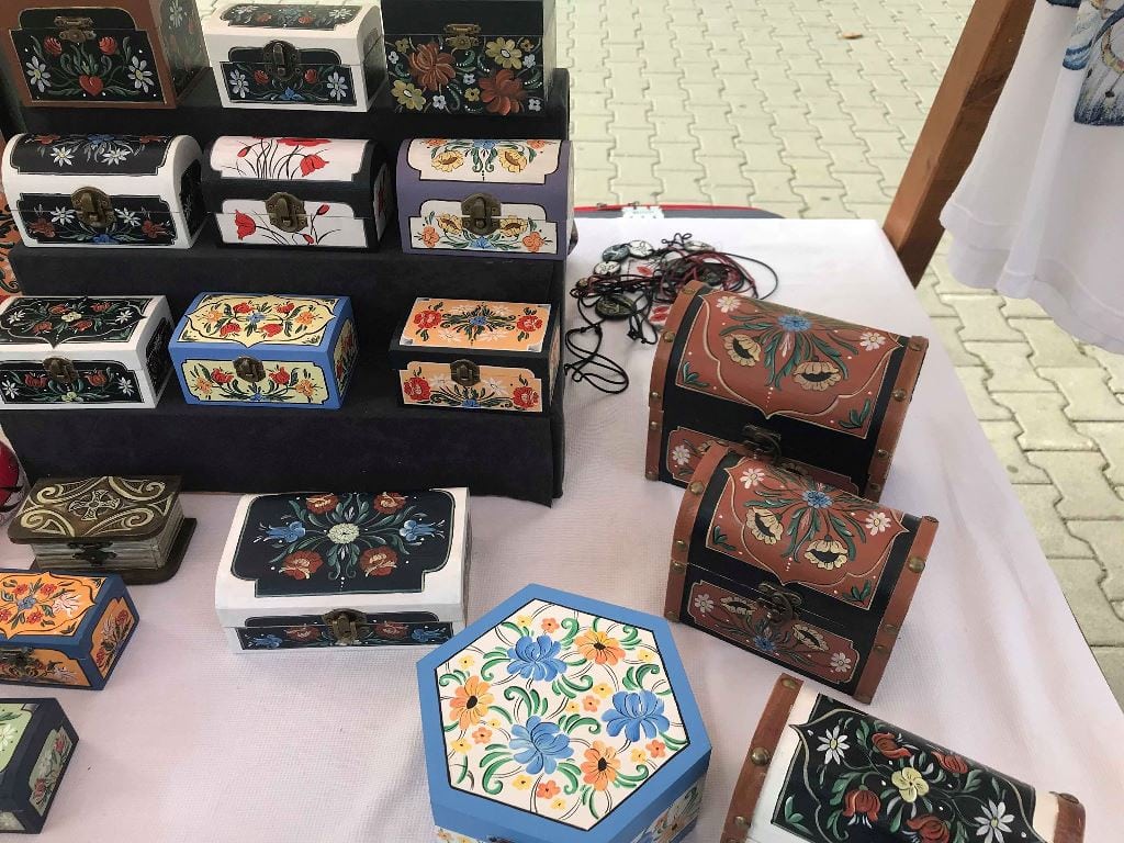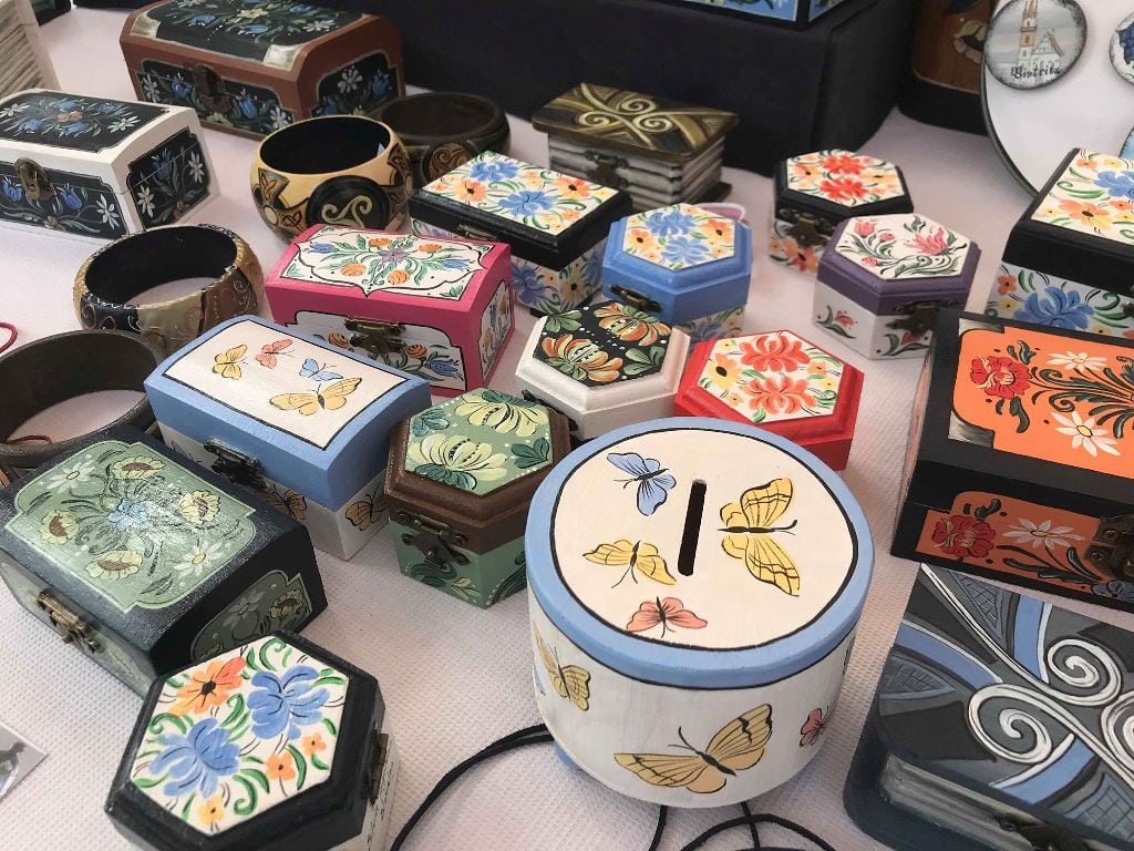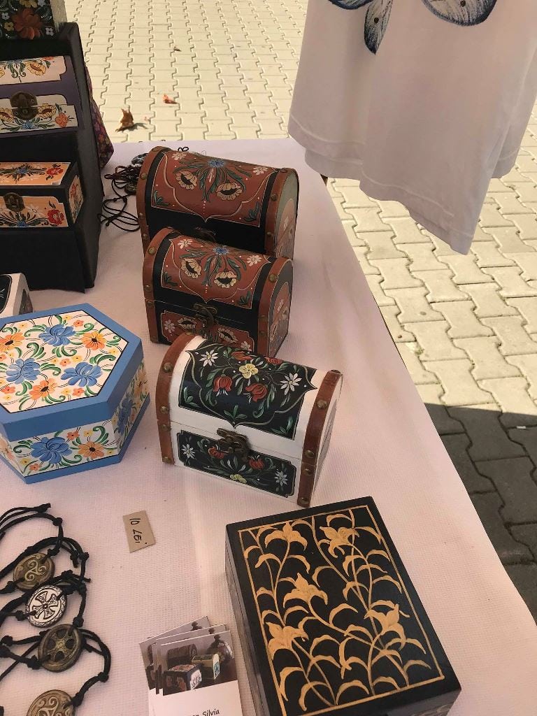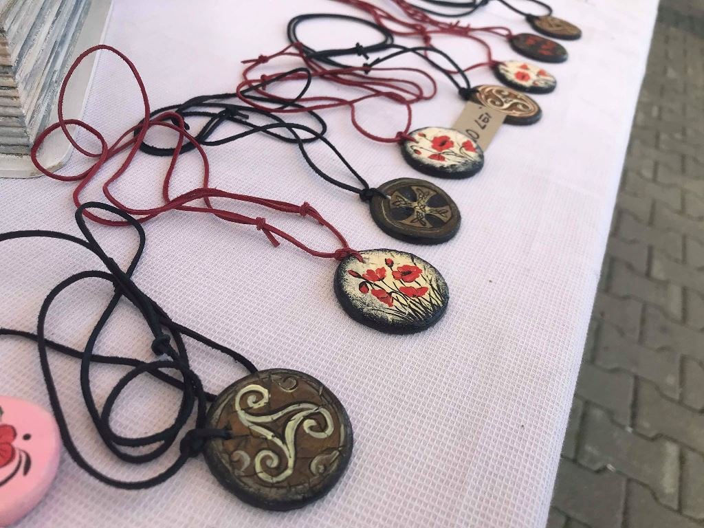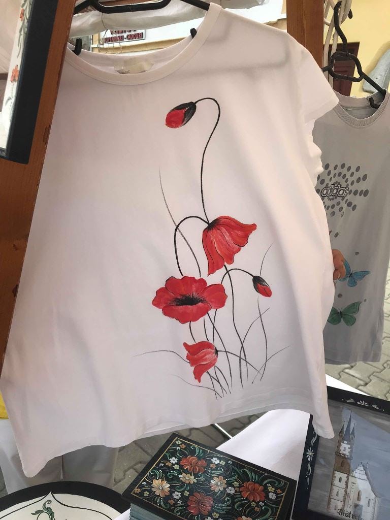 Să nu mai vorbim de magneți de frigider, pușculițe, rame de oglinzi sau cutii pentru vin. Însă ce e și mai special, Silvia Țogorean pictează și pe textile! La târg sunt afișate tricouri cu maci și fluturi, însă doritorii pot să-și personalizeze hainele după bunul lor plac.