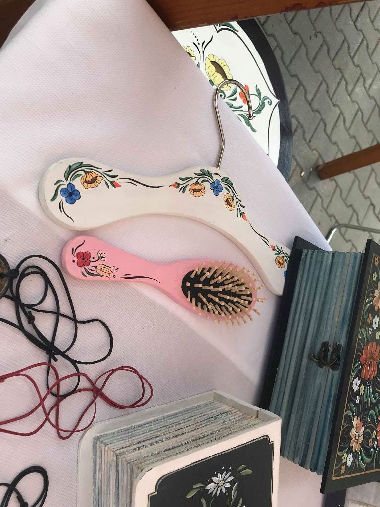 Apoi au urmat scăunele, mese și chiar dulapuri. Lucrează pe diferite podoabe, așa că fetele care doresc ceva personalizat, au la cine să apeleze, fie că e vorba de cercei, lănțișoare sau brățări. Am găsit chiar și umerașe și piepteni de păr cu diferite modele florale.