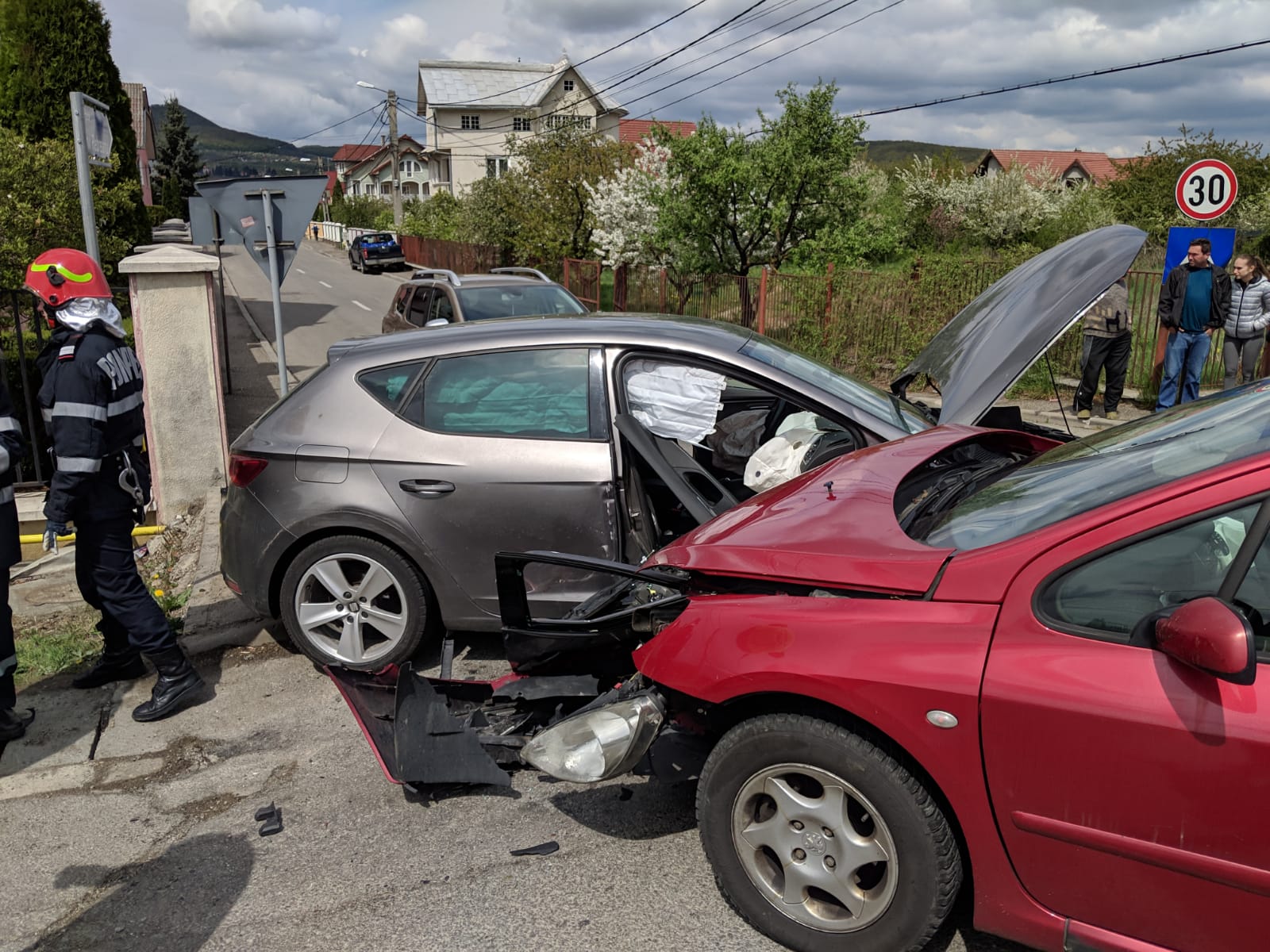 În urmă cu puțin timp, două mașini au fost făcute praf, după ce un șofer s-a speriat de manevrele făcute de conducătorul auto din fața sa, a tras de volan și a lovit o mașină, care a ricoșat în a treia.
