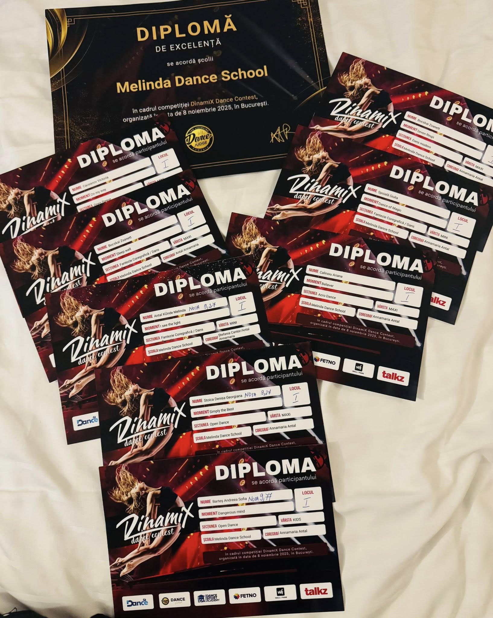 Sportivele de la Melinda Dance School din Bistrița au câștigat nu mai puțin de 8 locuri 1 la DinamiX Dance Contest, concurs ce a avut loc la București, în data de 8 noiembrie. Trei dintre ele s-au calificat la competiția ROMA Winter Edition 2026 – DANZE Italia.