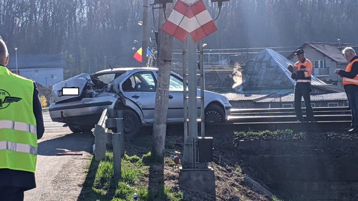 O mașină nu a oprit la semnalele acustice și luminoase de la trecerea la nivel cu cale ferată, fiind lovită în plin de tren.
