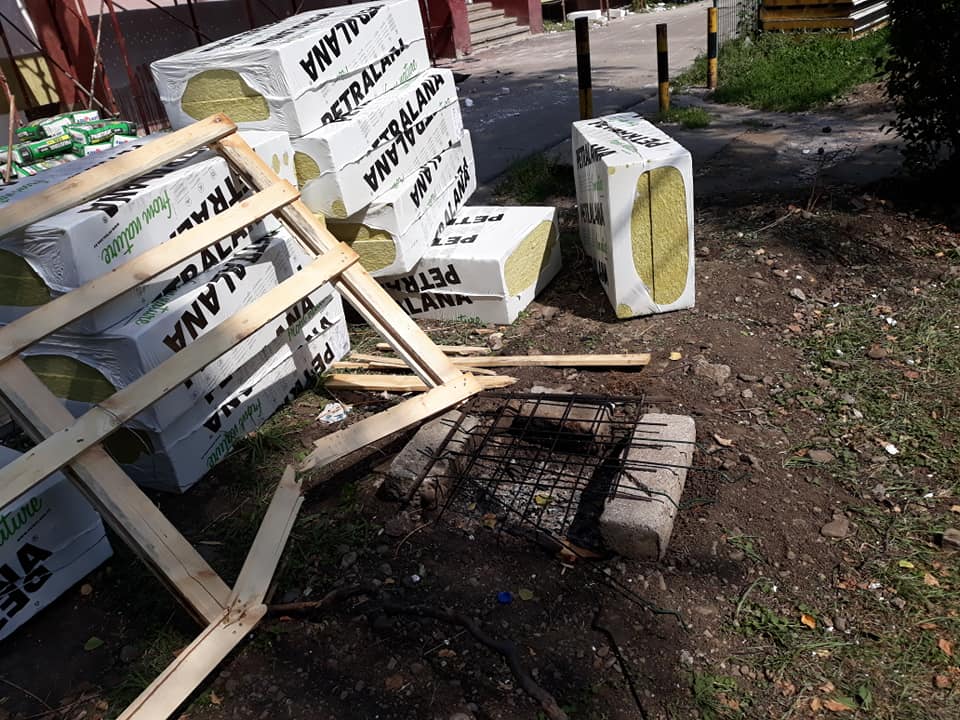 Un muncitor a profitat ieri de vremea frumoasă și a pus-o de un grătar, chiar în mijlocul orașului, lângă blocul pe care îl anvelopa. S-a folosit de câțiva bolțari și o bucată de gard pentru a improviza un grătar.