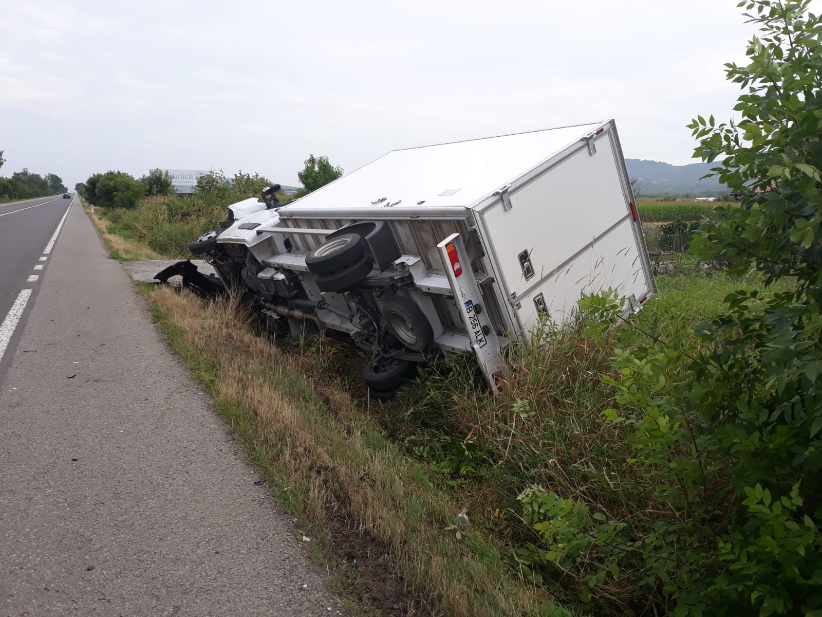 În urma impactului, autoutilitara s-a răsturnat în șanț. Mașina mică a ajuns pe contrasens, unde a fost lovită de o altă mașină care circula regulamentar.