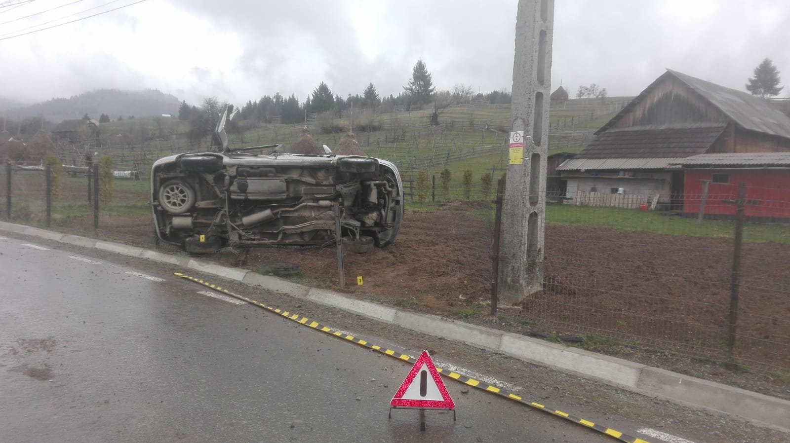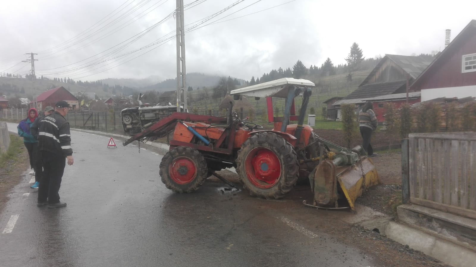 La un moment dat, dintr-o curte, le-a ieșit în față un tractor. În urma impactului, mașina s-a răsturnat.