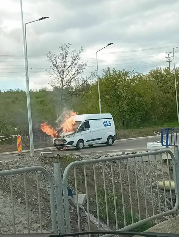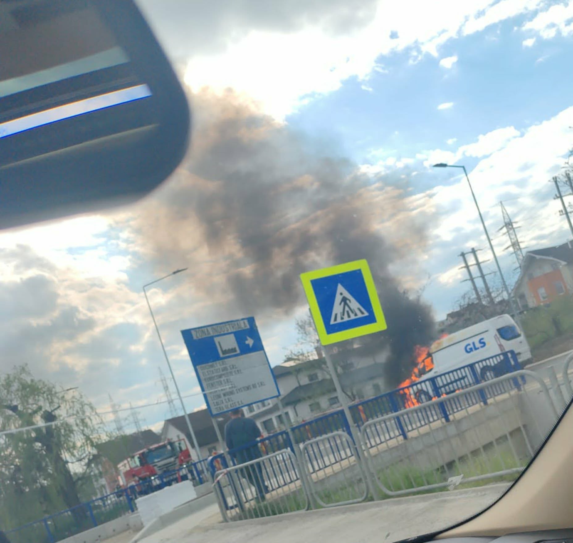 Mașina aparține unei firme de curierat. Echipajele au ajuns de urgență la fața locului și acționează pentru a stinge flăcările.