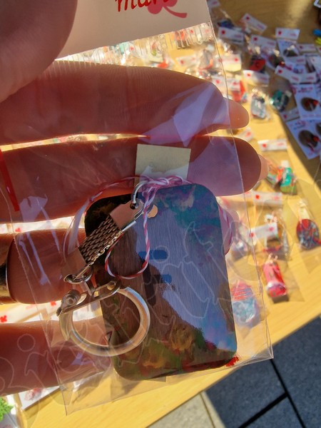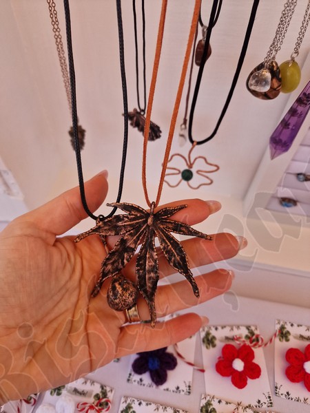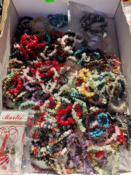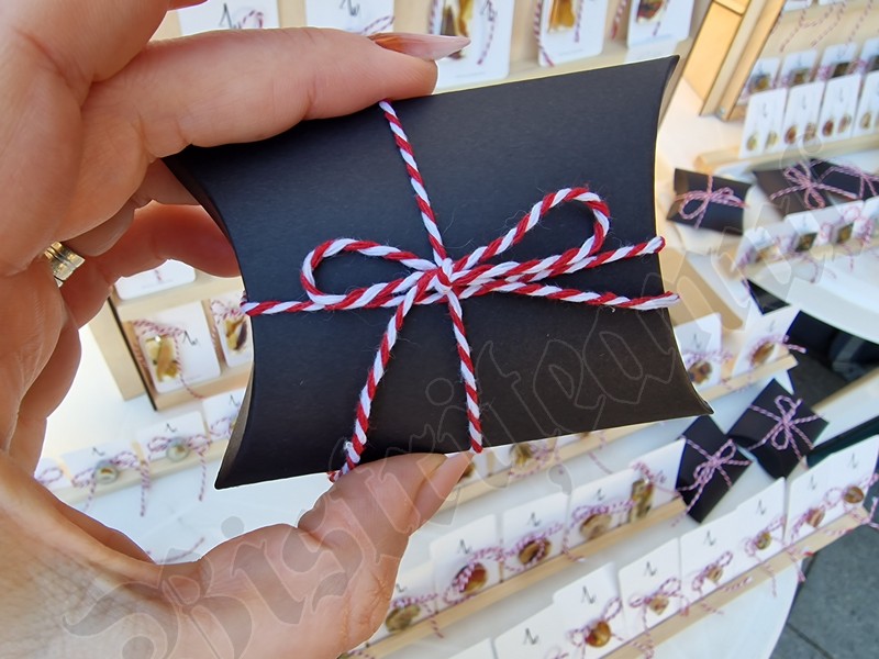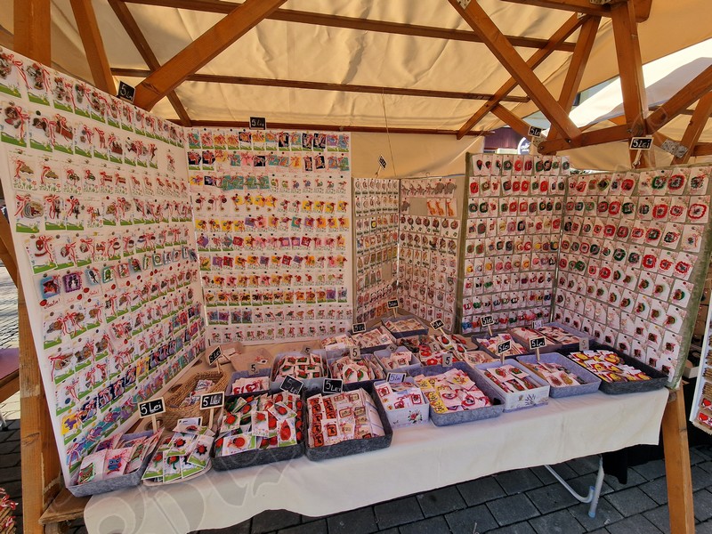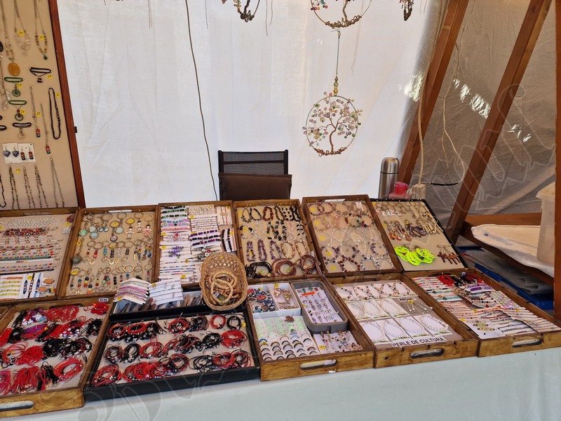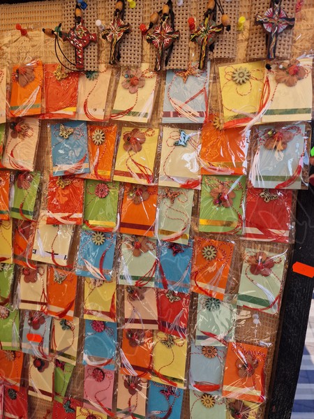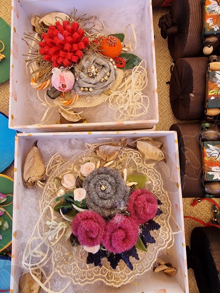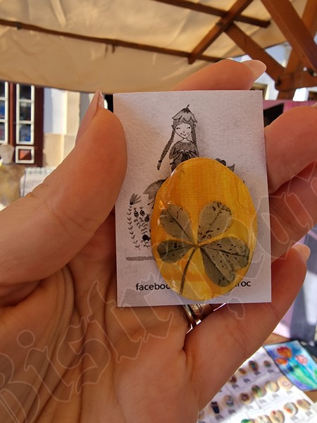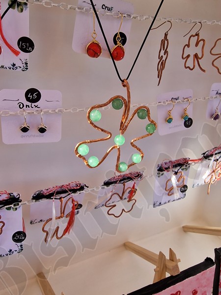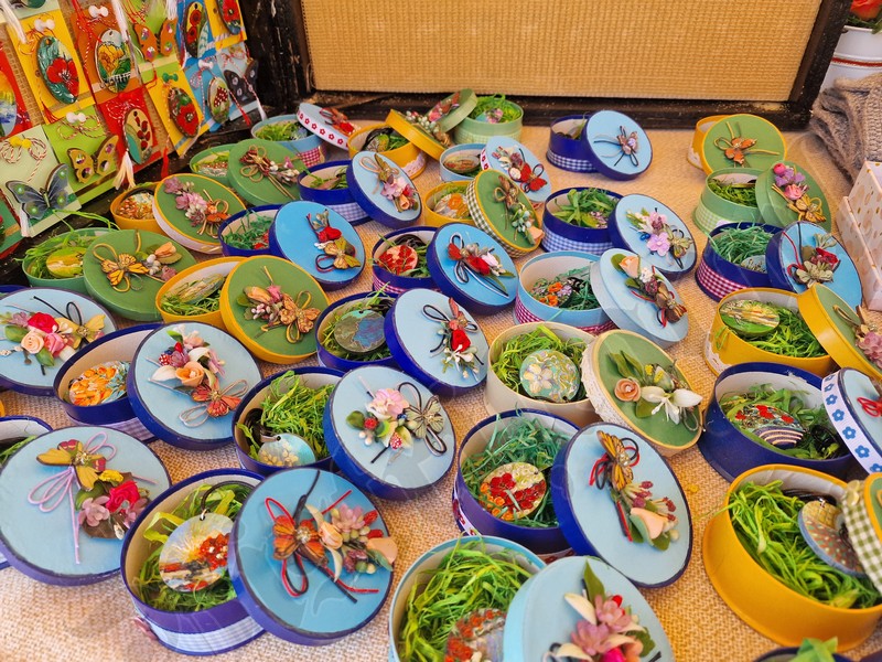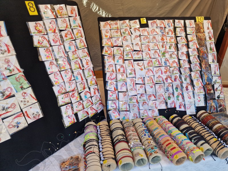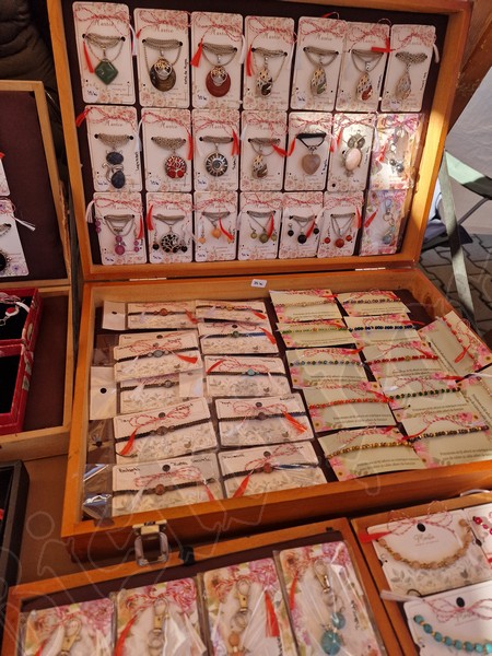Cu un șnur roșu și alb sunt puse spre a fi cumpărate tot felul de pietre de mare, flori presate, chiar și un trifoi cu cinci foi, extrem de norocos.