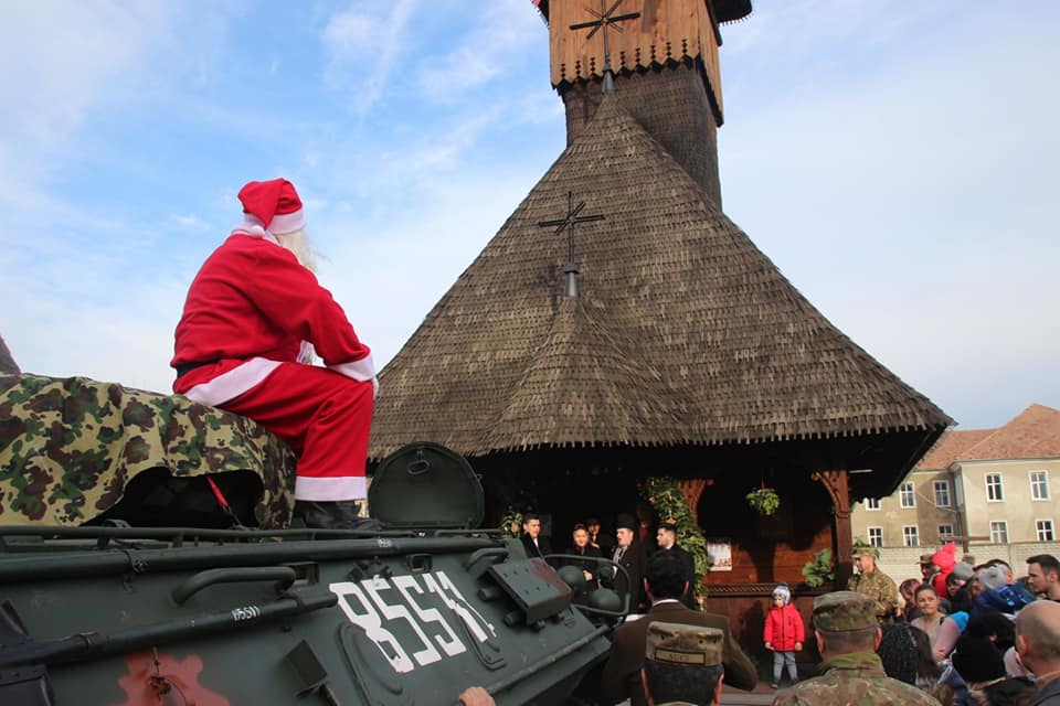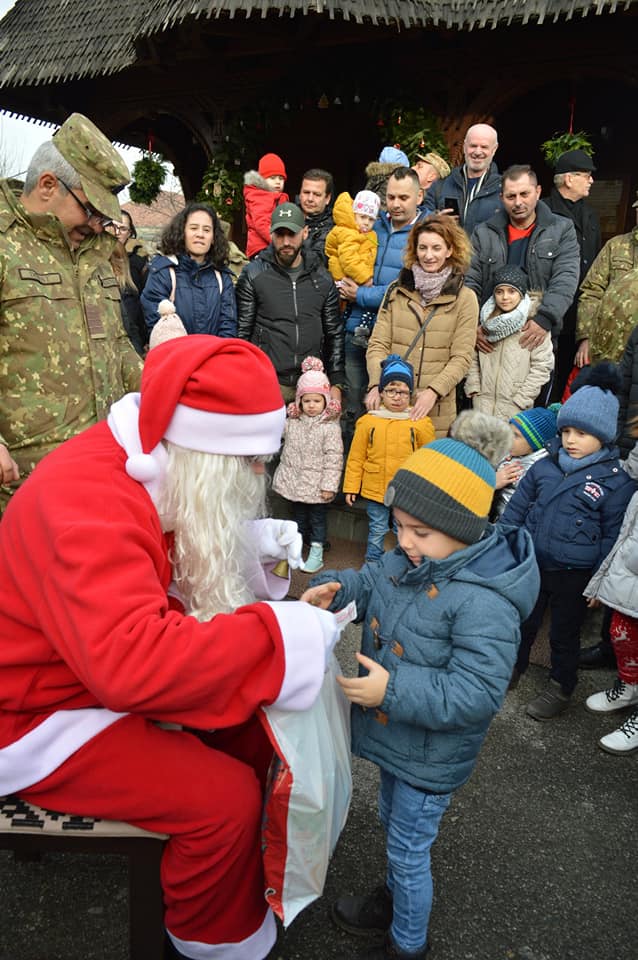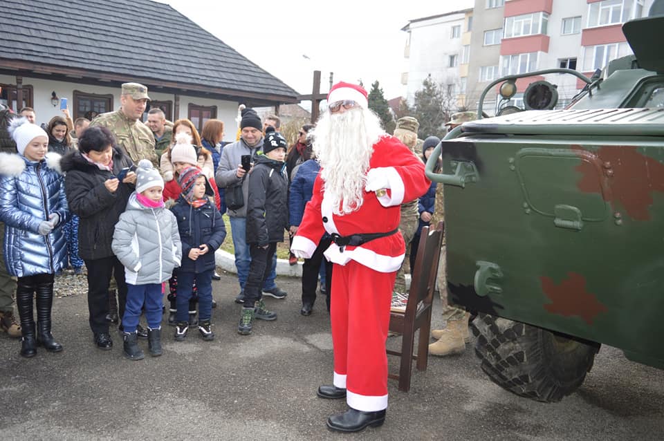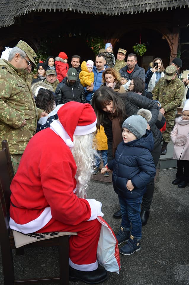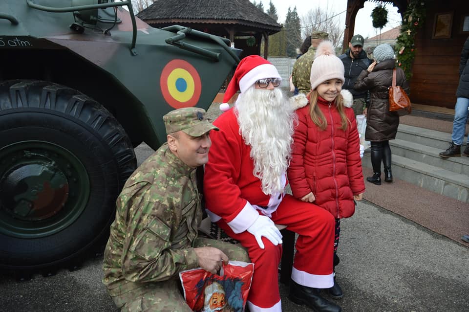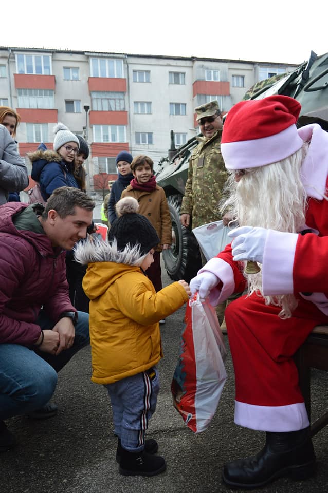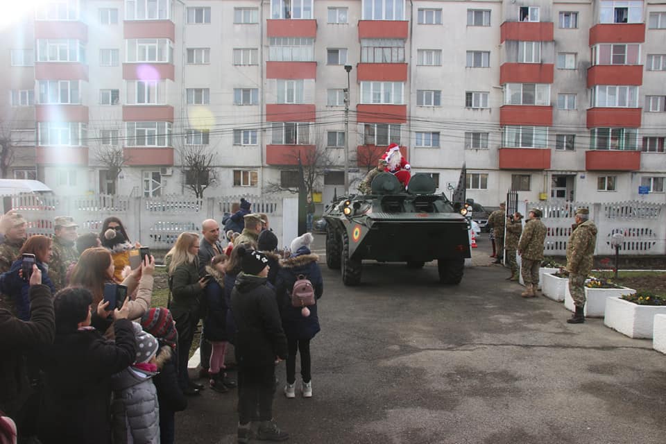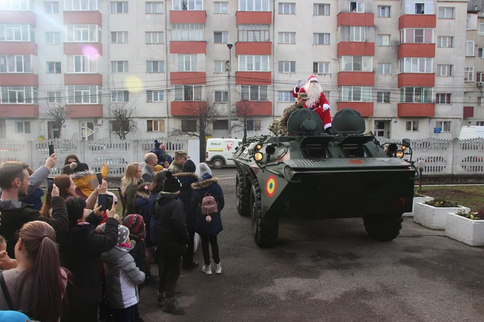 „La Bistrița, Moș Crăciun și-a făcut apariția cu un transportor amfibiu blindat, încărcat cu bucurii, cadouri și jucării. Personajul magic a fost întâmpinat cu entuziasm și emoții de copiii personalului, iar pentru darurile oferite a fost răsplătit cu o mulțime de colinde și poezii, care mai de care mai frumoase! Vă dorim Crăciun Fericit, cu lumină și bucurie în suflet”, au scris cei de la Brigada 81 Mecanizată „General Grigore Bălan” pe Facebook.