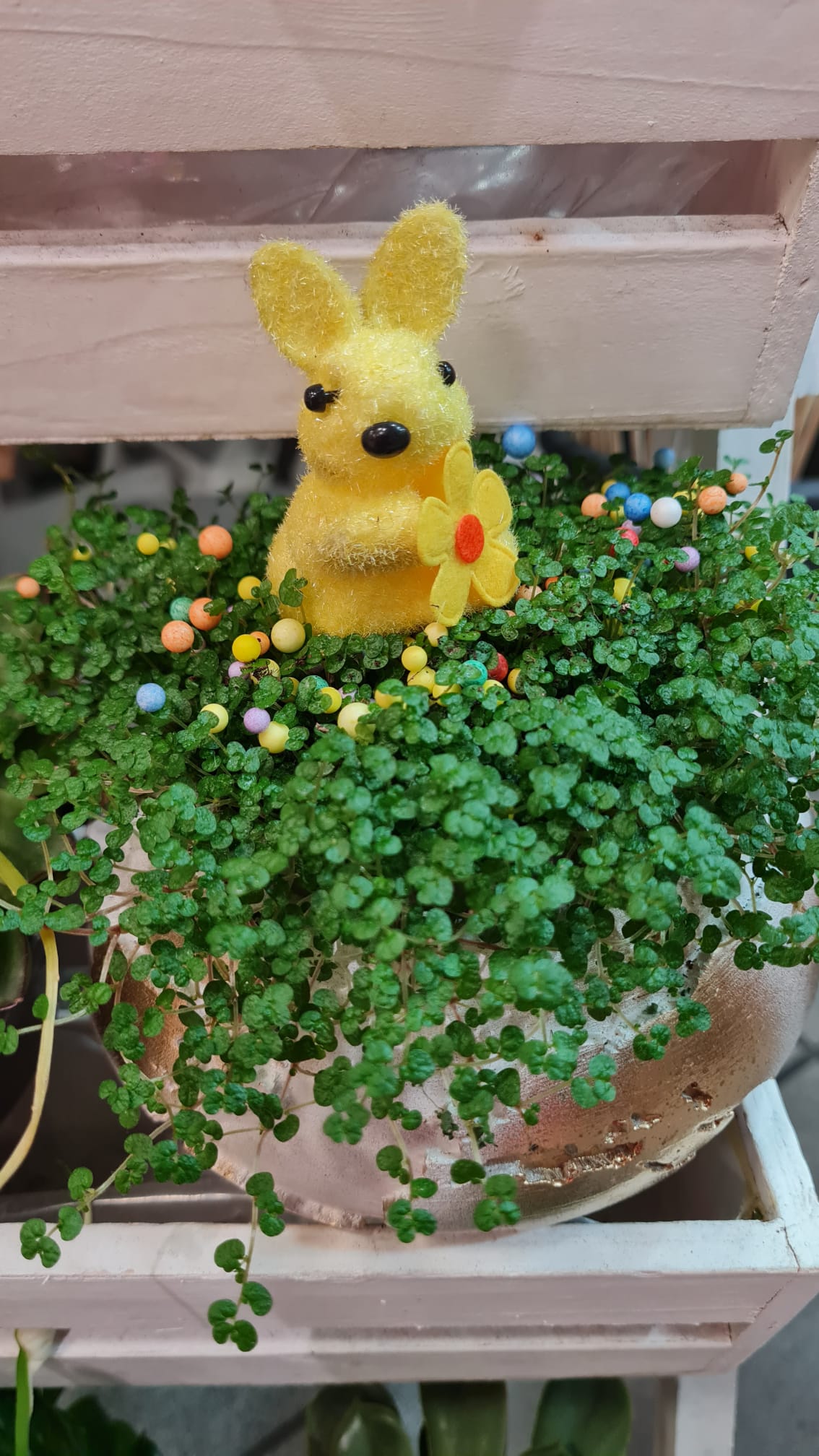 La modă în acest sezon este și verdeața, care este combinată cu figurine ce înfățișează iepurași, ouă și puișori.