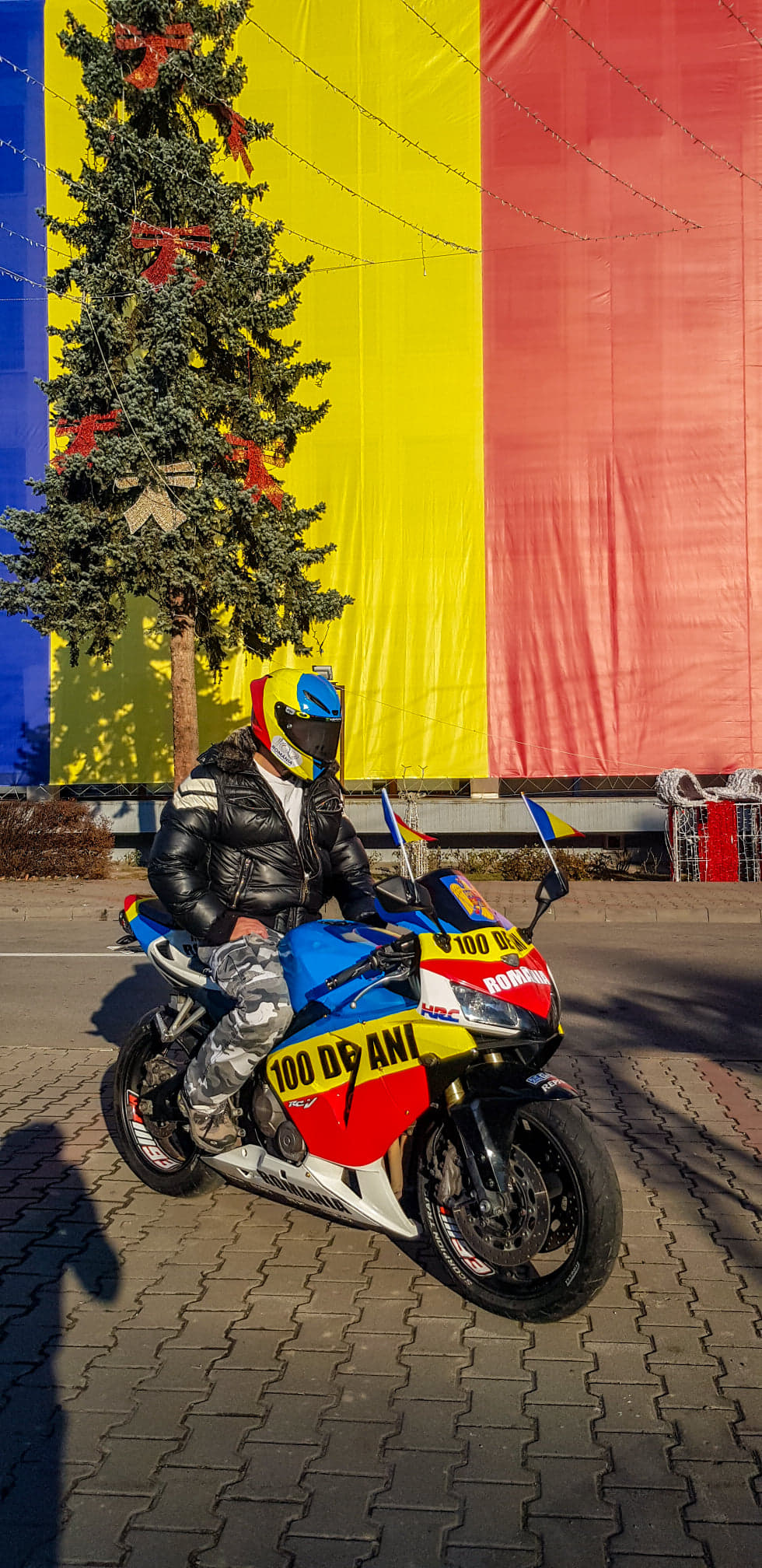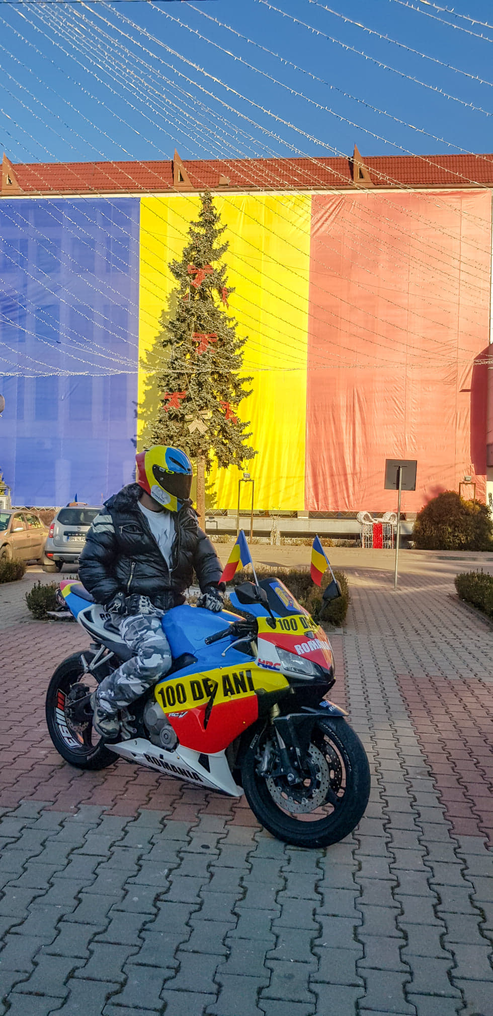 Steaguri, panglici, agrafe sau papioane, toate au astăzi cele trei culori ale steagului țării noastre! Fiecare român și-a ales accesoriul preferat pentru a-și demonstra patriotismul. Cristi însă a ales să facă un gest mai aparte. El și-a vopsit motorul și casca în culorile tricolorului.