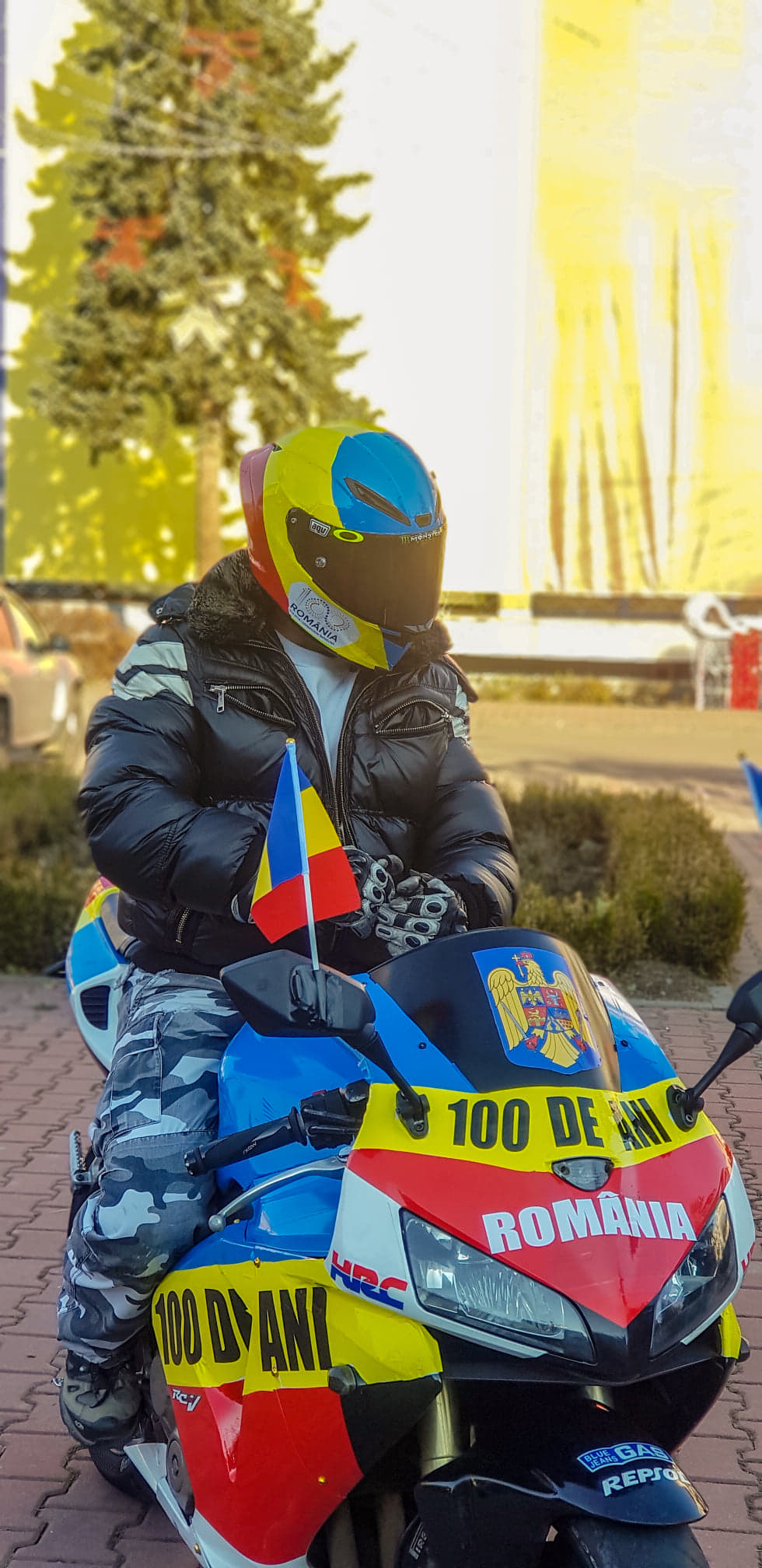 Pe partea din față a motocicletei apare și stema României, iar în spate e scris mesajul „100 de ani”, același mesaj care apare și pe cască.