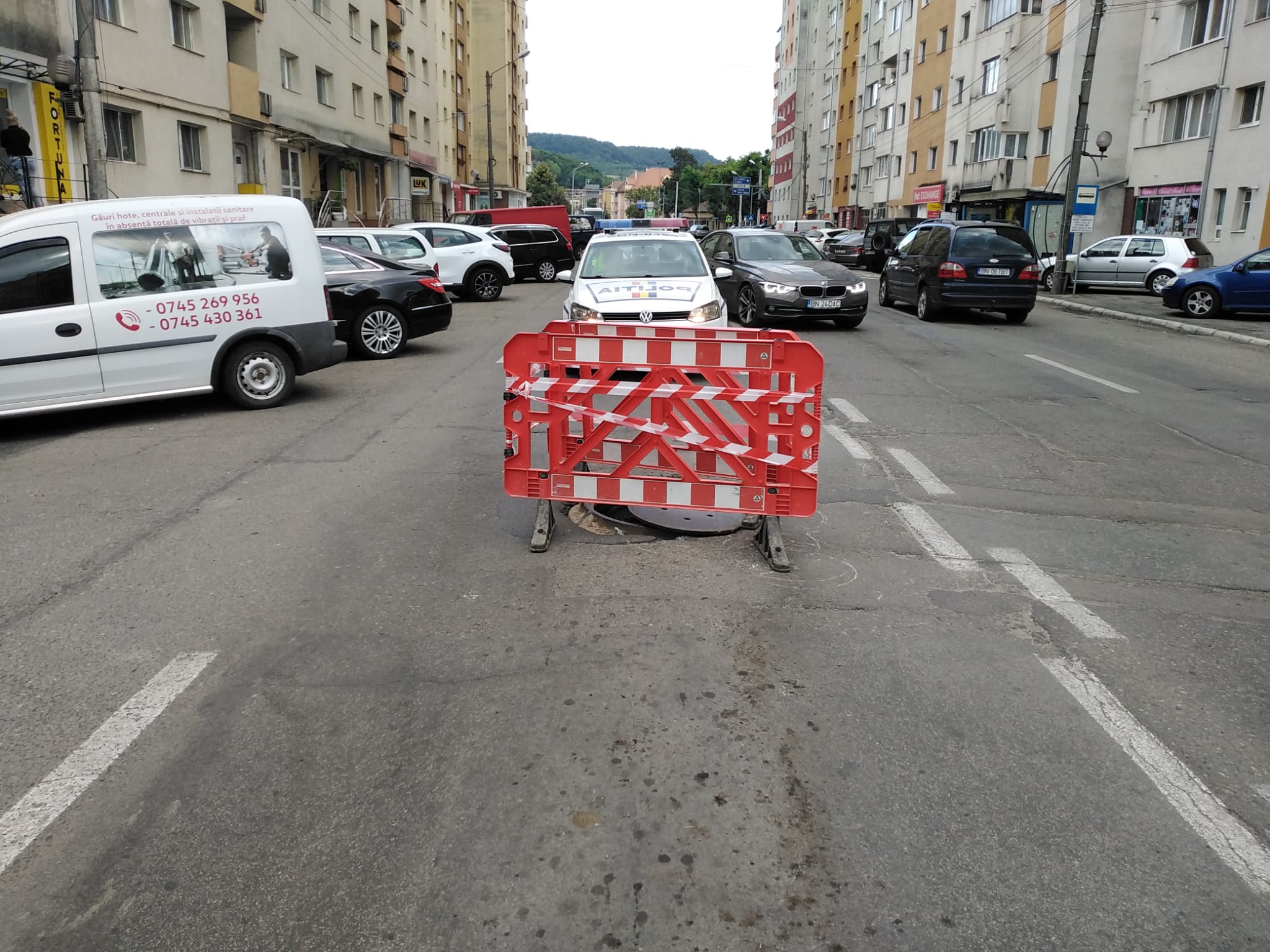 După „incident”, acesta a fost semnalizat cu un triunghi reflectorizant și cam atât. Reprezentanții Aquabis au fost de negăsit după mai multe ore în care au primit apeluri telefonice, iar problema a fost rezolvată de… Primăria Bistrița.