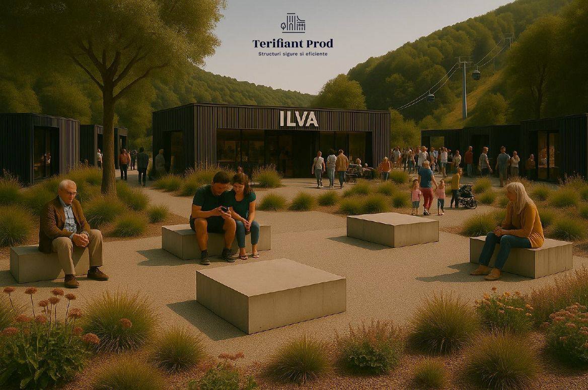 Proiectul prevede și un camping modern (100–150 persoane), cu zone pentru corturi și unități de cazare tip container, pavilion central, spații comune și facilități moderne.