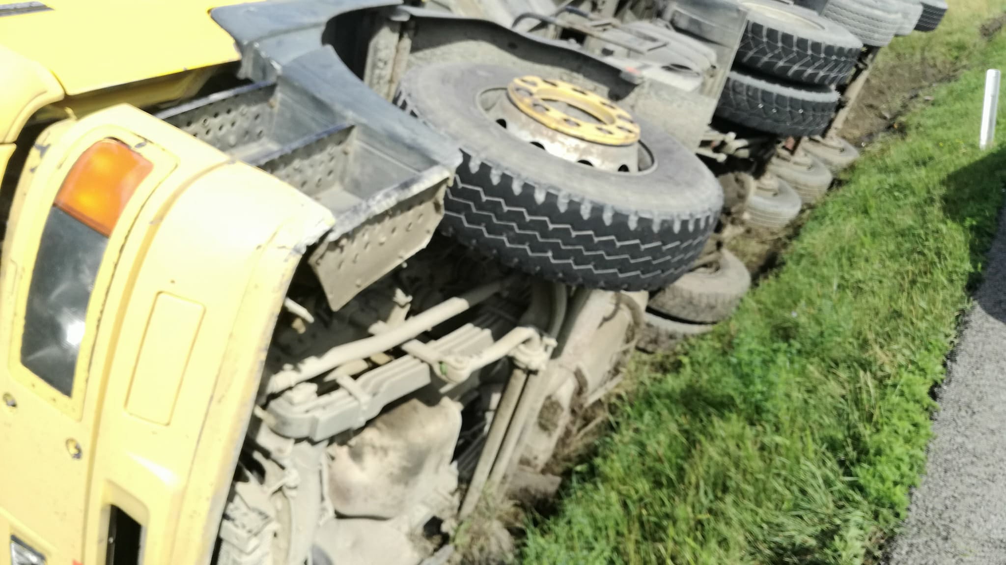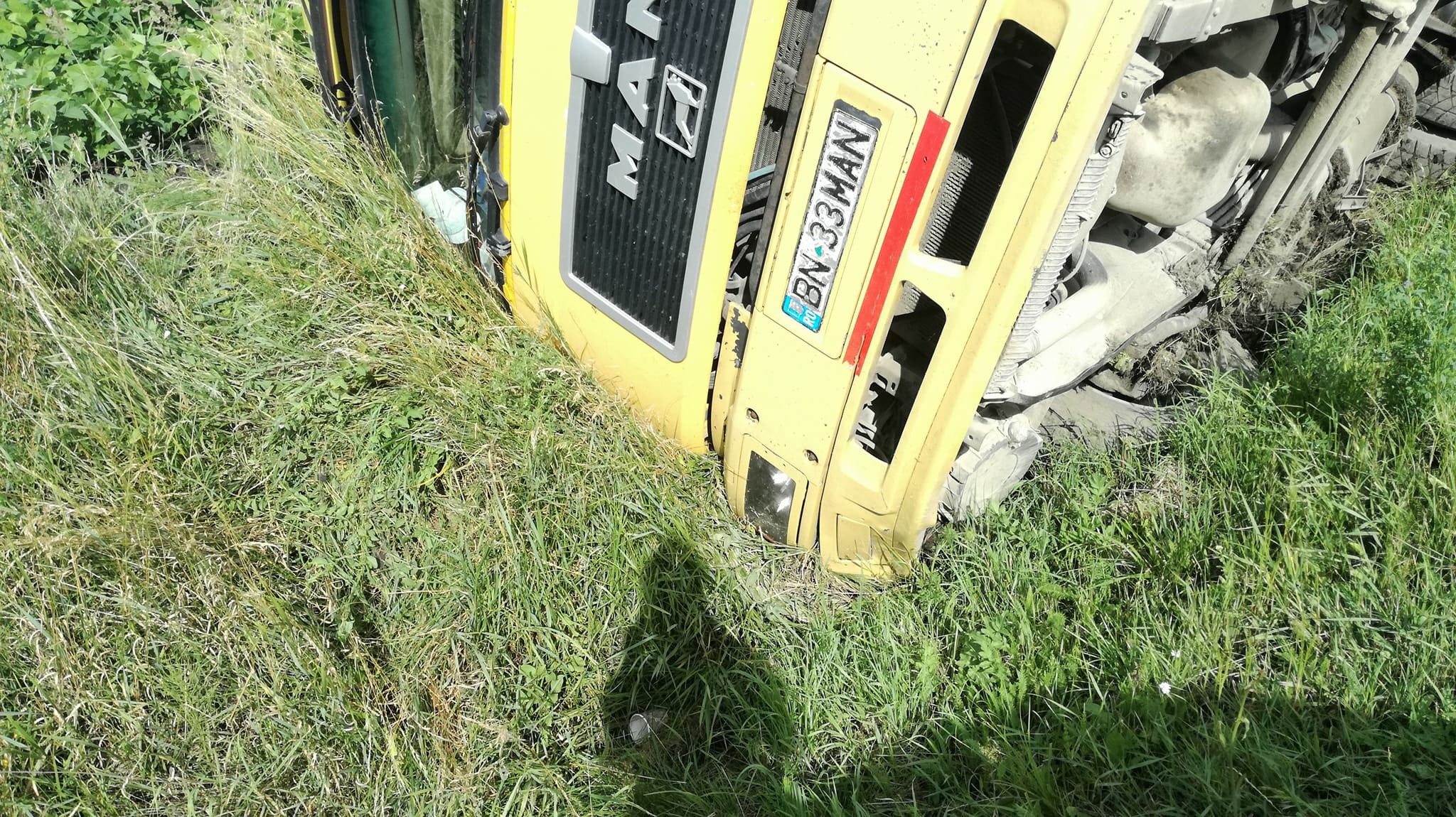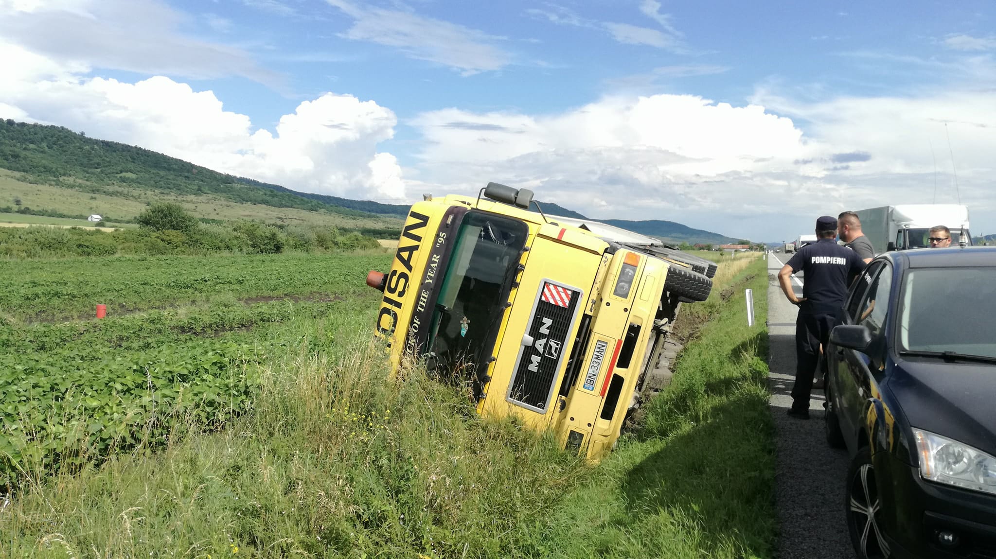 Deși s-a răsturnat cu mastodontul, șoferul a scăpat fără nicio zgârietură. Acesta ar fi pierdut controlul volanului după ce ar fi tras prea tare dreapta pentru a evita o coliziune cu un autoturism intrat în depășire.