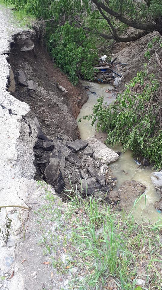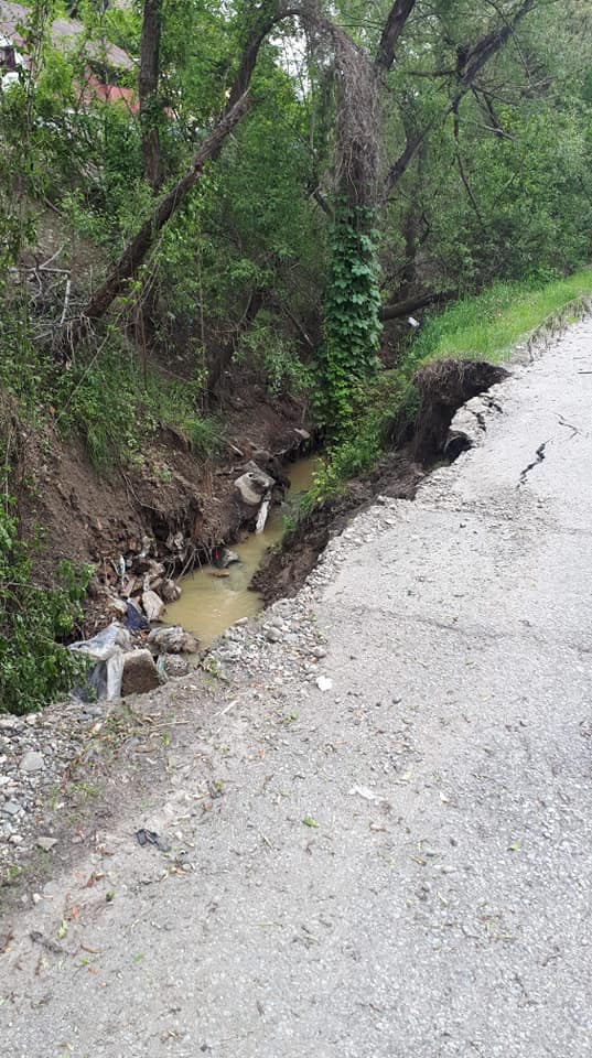 Ploile din ultima perioadă au început să erodeze inclusiv asfaltul. Drumul spre Jelna, imediat după intersecția cu Valea Ghinzii, o pornește la vale. O bucată bună din carosabil este deja ruptă și ploile continue nu ajută deloc.