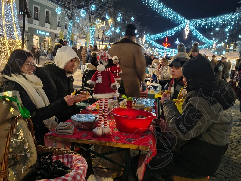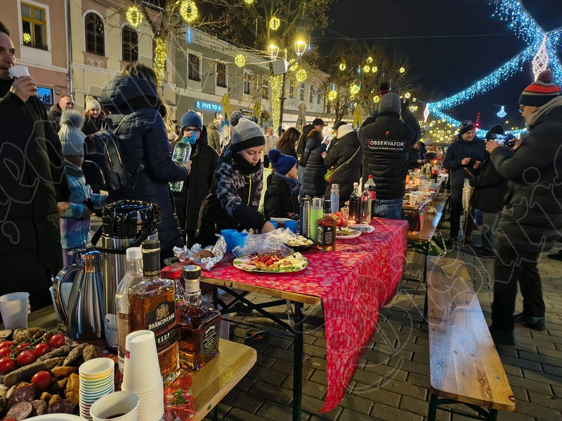 Cei care și-au rezervat mesele în centrul orașului le-au umplut cu prăjituri, cozonaci, platouri, covrigei și fursecuri. Ca să învingă temperaturile scăzute de final de decembrie, oamenii s-au „înarmat” cu vin sau țuică fiartă. Unii au venit de acasă cu pături, cojoace și pieptar din blană de oaie. Pentru că oaia nu minte, iar blana ei ține căldura pe tine, cât o fi frigul de mare…