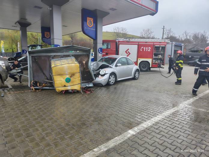 Un accident a avut loc în stația PECO din Teaca. În urma coliziunii dintre două mașini, 1000 de litri de combustibil au fost împrăștiați pe jos. Pompierii curăță zona pentru a preveni alte pericole.