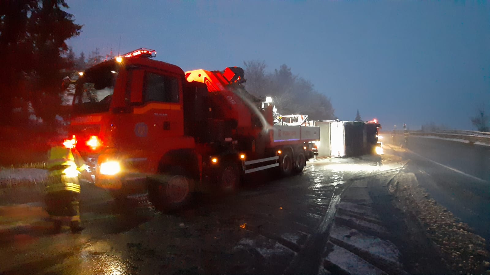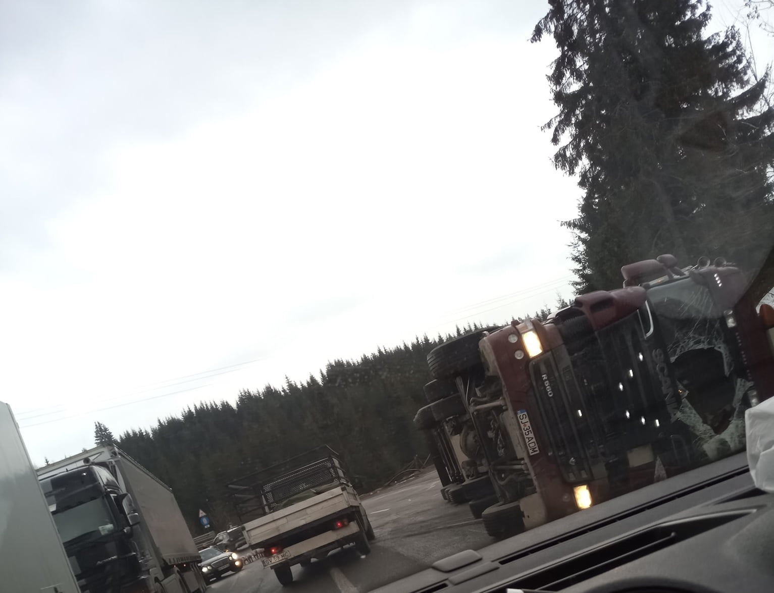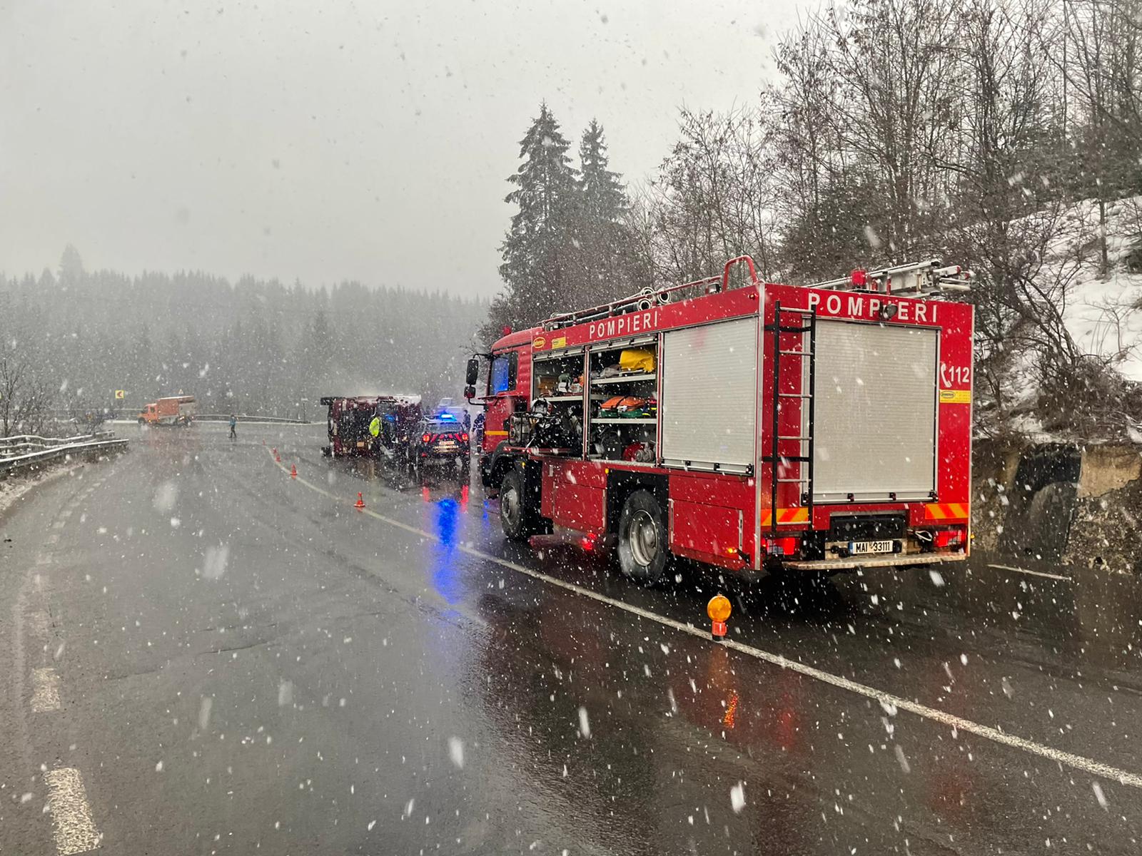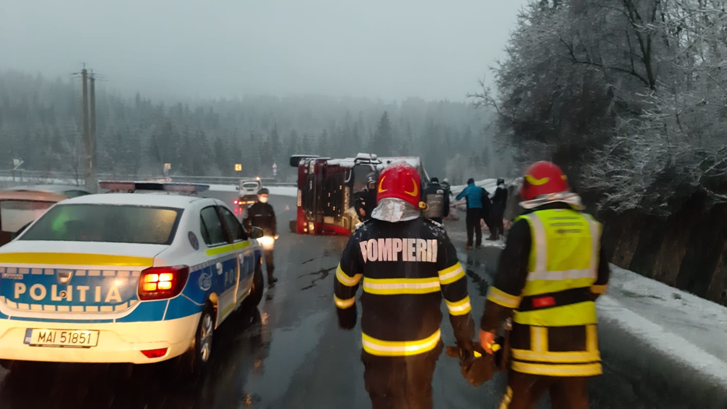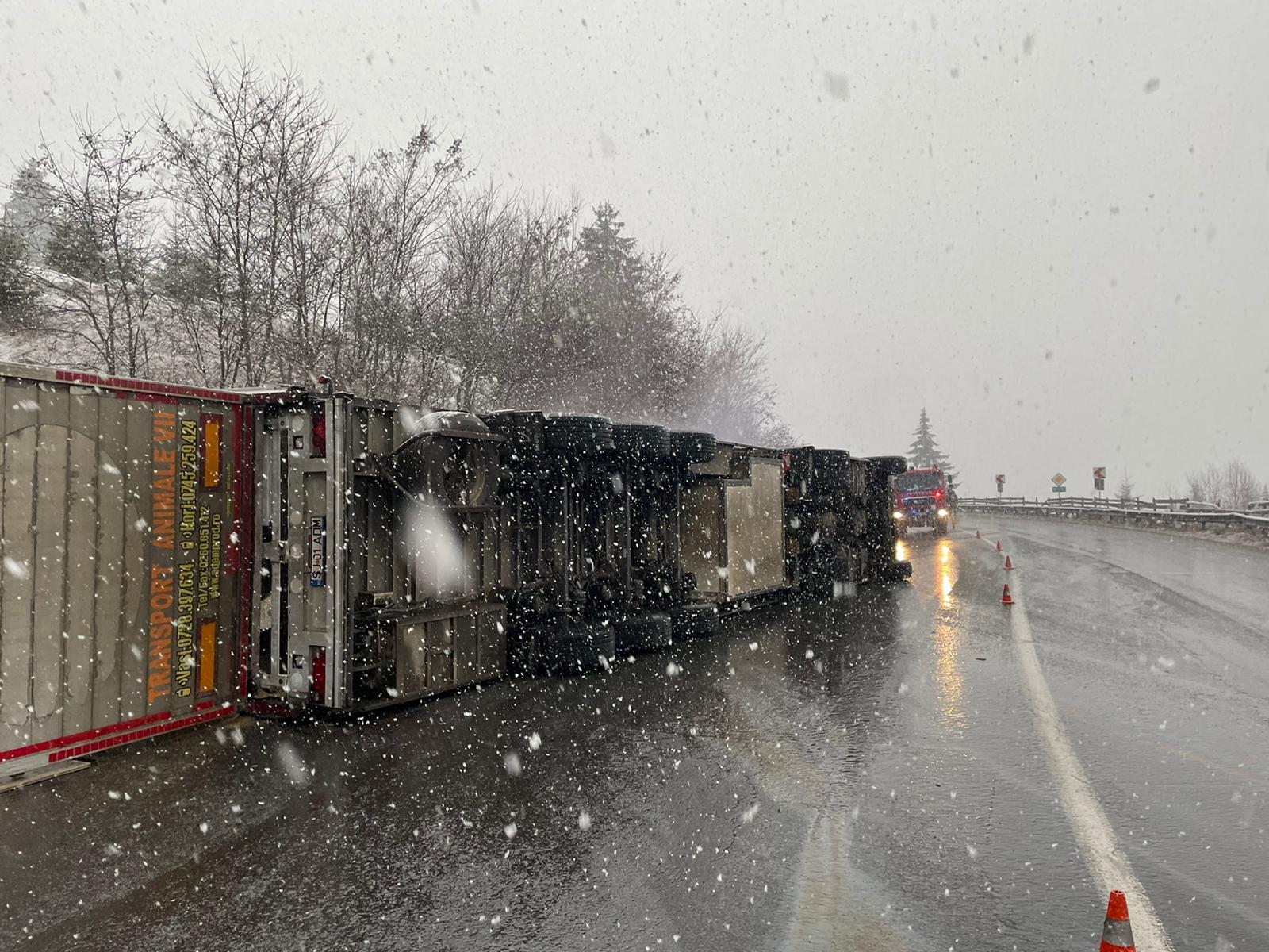 În urmă cu puțin timp un autotren încărcat cu porci s-a răsturnat în Pasul Tihuța. Șoferul și persoana care-l însoțea au reușit să se evacueze din autocamion și sunt conștiente.