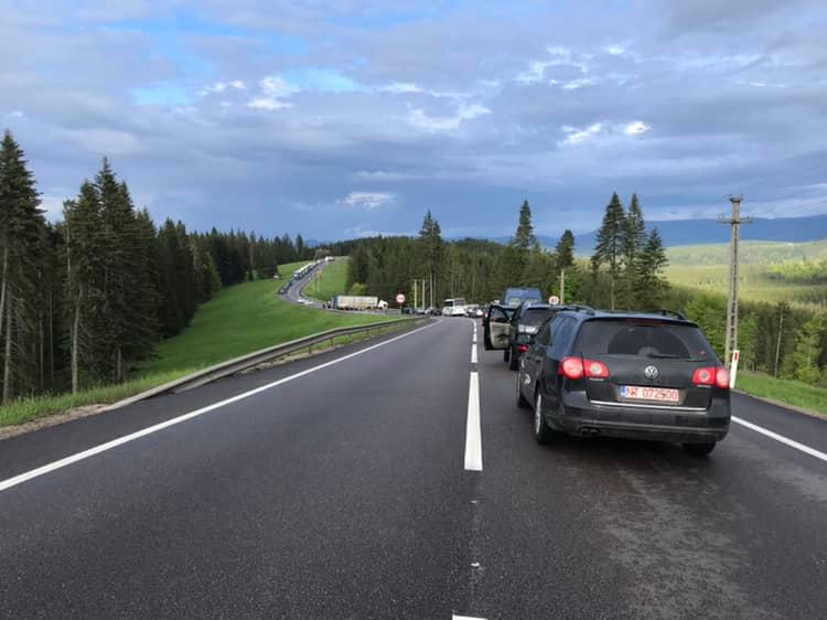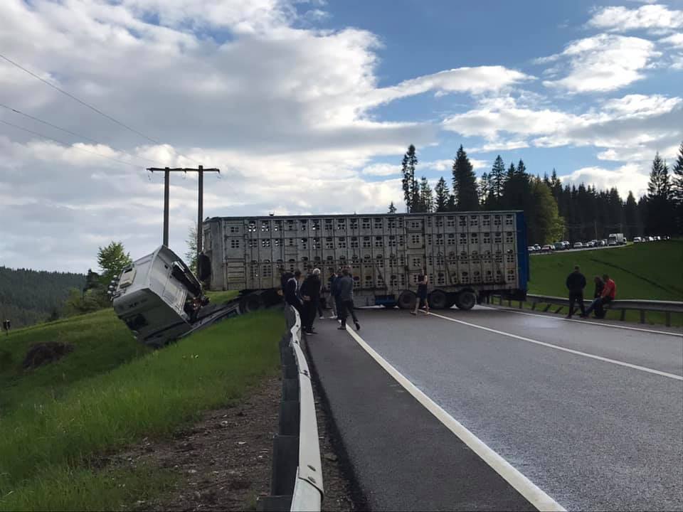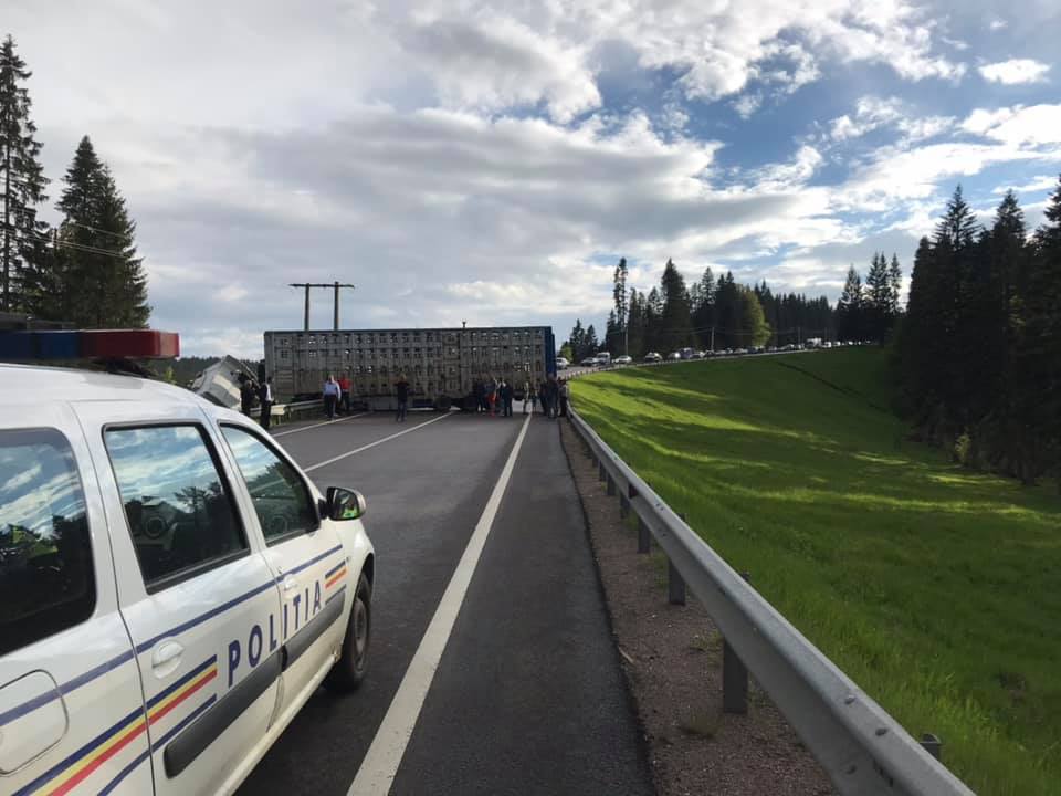 În urmă cu puțin timp, un TIR care, se pare, transporta oi, a blocat DN17, în Pasul Tihuța, la granița cu județul Suceava. Șoferul mastodontului a pierdut controlul volanului, după ce ar fi făcut balans într-o curbă periculoasă, iar TIR-ul a ajuns de-a latul pe șosea.