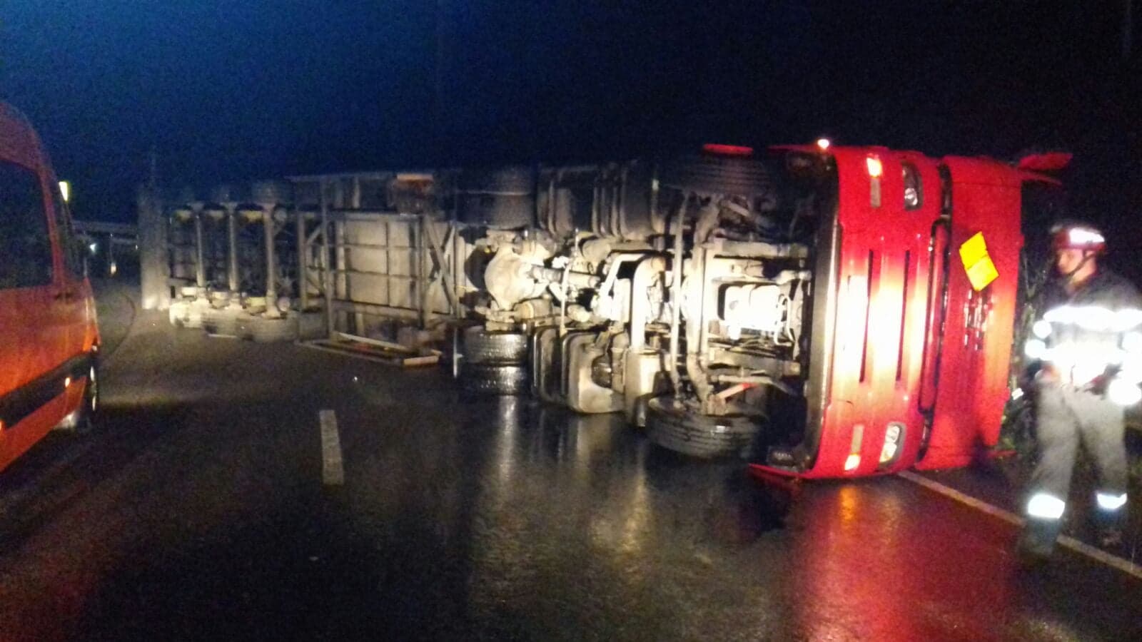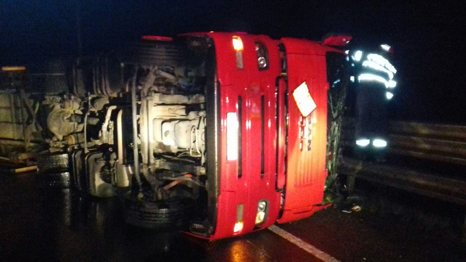 Se pare că șoferul TIR-ului a pierdut controlul volanului, a ajuns pe contrasens, unde s-a răsturnat. Acesta a fost ușor rănit.