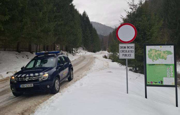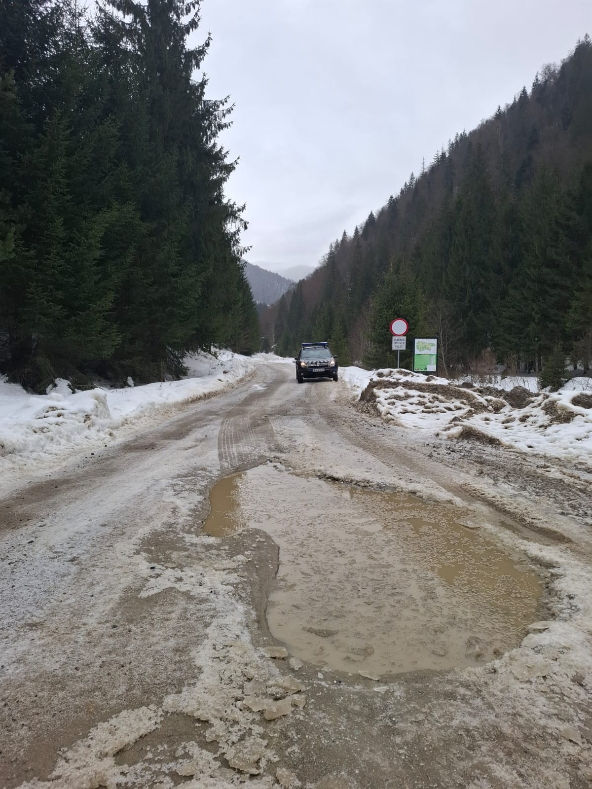Iarna e încă în plină desfășurare, așa că munții sunt acoperiți de zăpadă. La fel este situația și când vine vorba de drumuri forestiere sau chiar naționale.