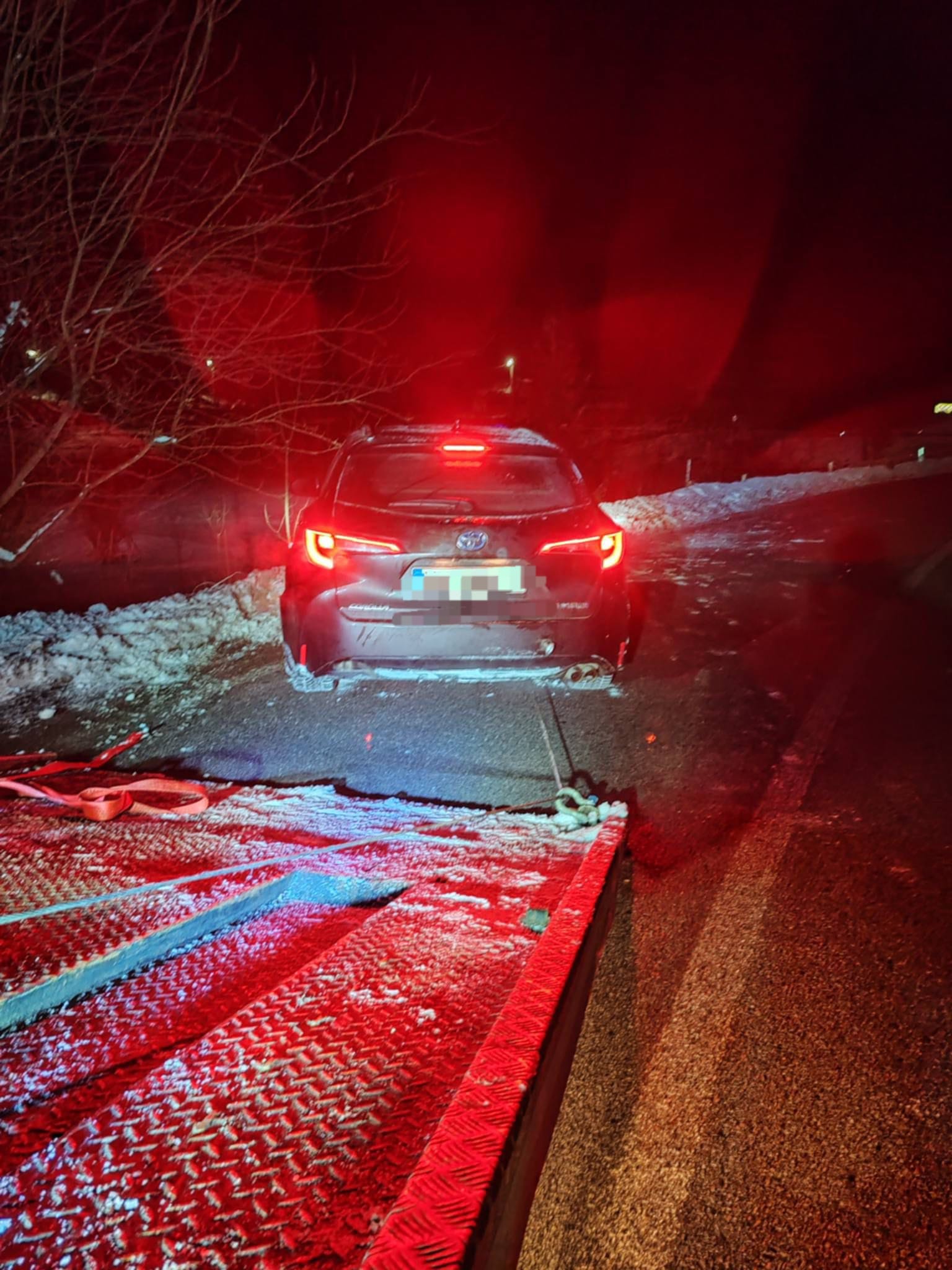 Traficul în zonă a fost îngreunat până când mașina a fost scoasă din zăpadă și urcată pe o platformă.