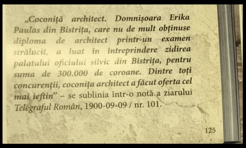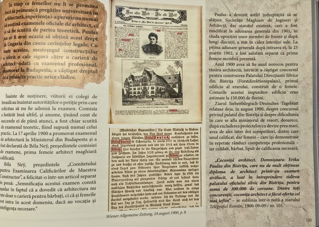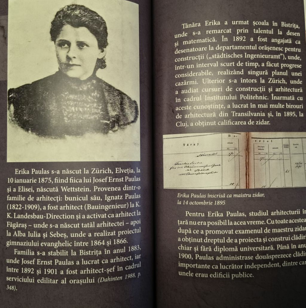 Presa din Viena, Budapesta și Transilvania era plină atât de referințe elogioase, dar și unele caricaturale, legate de reușitele unei tinere din Bistrița. La doar 25 de ani, Erika Paulas reușea să pătrundă într-un domeniu rezervat exclusiv bărbaților: arhitectura, devenind, în 1900, prima femeie arhitect din Ungaria. Erika Paulas s-a născut în Zurich (Elveția) și a murit în aprilie 1961 la Bistrița. Aici s-a stabilit familia ei încă din 1883.